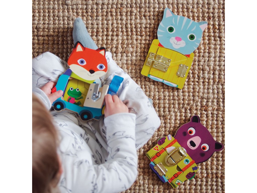 Hra s otváraním zámkov Locktou Učenie hrou: otváranie zámkov na troch zvieratkách a tréning jemnej motorikyLocktou od značky Djeco je drevená manipulačná hra, v ktorej dieťa skúša otvárať a zatvárať rôzne typy zámkov na troch roztomilých zvieratkách. Každé zvieratko má iný mechanizmus, takže dieťa prirodzene trénuje prsty, koordináciu a sústredenie – presne tak, ako to malé deti baví.Po otvorení „dvierok“ sa objaví obrázok. Skvelá aktivita na pokojné hranie doma, do škôlky aj ako darček.Rýchly prehľad odporúčaný vek: od 3 rokov typ hry: manipulačná / edukačná hra rozvíja: jemnú motoriku, trpezlivosť, logiku pri riešení „ako to otvoriť“ v balení: 3× drevené zvieratko so zámkom, návodČo sa deti naučia pracovať s rôznymi mechanizmami (západka, kľúč, posuv) precízny úchop a správny tlak prstov samostatnosť pri každodenných činnostiach (zipsy, gombíky, zámky)Technické parametre materiál: drevo, kovové prvky počet zvieratiek: 3 rozmery balenia: cca 23 × 23 × 4 cm
