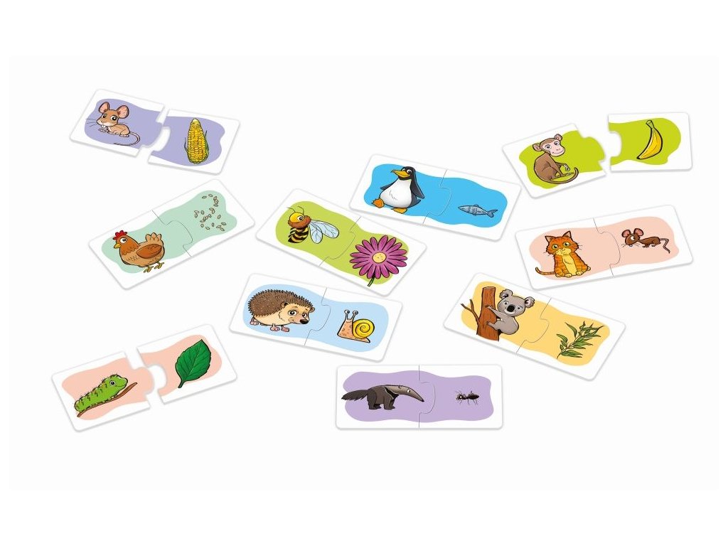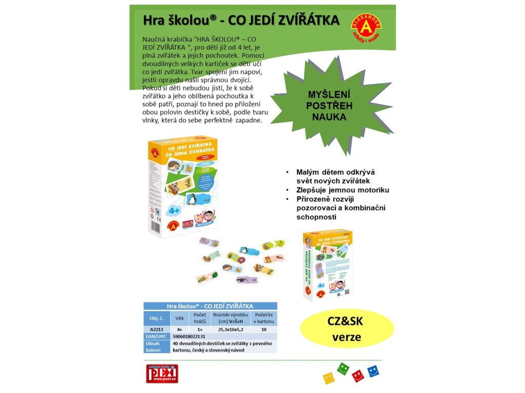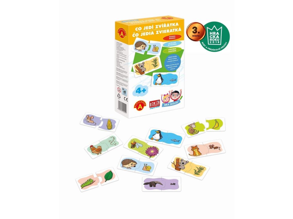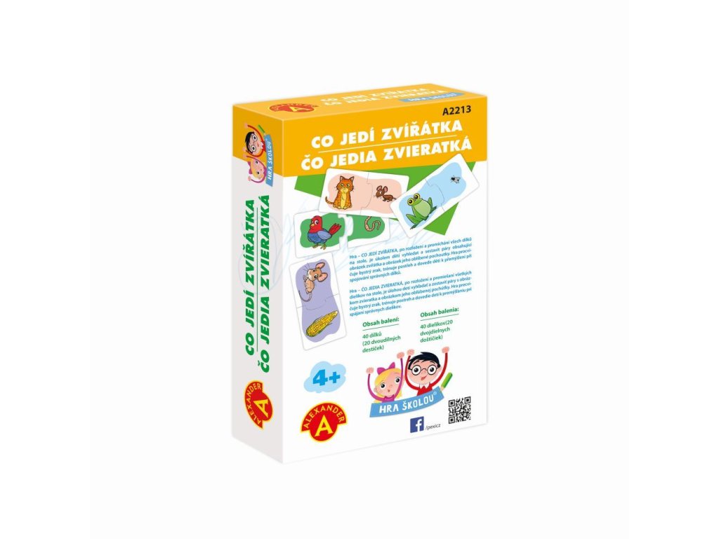 Náučné hranie pre malých objaviteľov. Krabička "HRA ŠKOLOU® - čo jedia ZVIERATKÁ", pre deti od 4 rokov, je plná zvieratiek a ich pochúťok. Čo je ježko? Čo maškrtí koala? Spoj 20 zvieratiek s ich obľúbenou dobrotou a trénuj postreh, pamäť i zrak. Kreslená stolová hra pre deti od 4 rokov. Poznáš všetkých 20 zvieratiek? Vieš, čo im chutí? Zostav 20 párov zviera + obľúbená dobrota a pokračuj v hre podľa svojej fantázie. Keď váhaš, spájaj dvojice podľa farieb. Obľúbená hra z edície Hra školou®. BENEFITY: - Veľa variantov hry. Keď zostavíte dvojice, môžete napríklad hľadať bylinožravcov, alebo dopĺňať ďalšie dobroty, ktoré zvieratkám chutia. - K hraniu kedykoľvek a kdekoľvek. Vezmite kartičky so sebou kamkoľvek, kde sa dieťa nudí. Stačí rozbaliť a rozprávať sa. - Rozvoj postrehu, fantázie i myslenia. Hra podporuje rozpoznávacie schopnosti detí i bystrý zrak. Dvojicu samostatne zostavia deti zhruba od 4 rokov veku. - Zábava aj pre dospelých. Prečo je koala len jeden druh potravy? Je panda len bylinožravec? Váhate? Spoznávajte svet spoločne. Koľko nápadov, toľko variantov Ako dieťa porastie, zvládne ťažšie a ťažšie úlohy. 1. Pre najmenších (od 4 rokov): Nechajte dieťa zložiť samostatne dvojice a prezerať si obrázky. 2. Stredná obtiažnosť: Dávajte dieťaťu konkrétne úlohy, napríklad nájdi všetky zvieratká, ktoré majú radi mäso. 3. Ťažšie otázky pre chytré hlavičky: Pýtajte sa a spoločne zisťujte potrebné: • Koľko zvieratiek z obrázkov žije v mori? • Ktorá zvieratká žijú u nás? • Čo ďalšie loví mačka / bocian / žaba .. • Ktorá zvieratká jedia iba jeden druh potravy? Čas trvania hry Záleží na vás. Stačí pár minút času a pevná podložka. Deti milujú zvieratká a kladú zvedavé otázky. Pripravte si k ruke encyklopédiu alebo mobil s internetom. Bezpečnosť na prvom mieste Dvojice kartičiek vo veľkosti cca 10 × 5 cm sú z pevného materiálu odolného proti rozhryzeniu alebo pádu z výšky. Utierajte ich vlhkou handričkou bez Jari a ďalších chemikálií. Hra je vhodná pre deti od 4 do 6 rokov.Dodatočné parametre