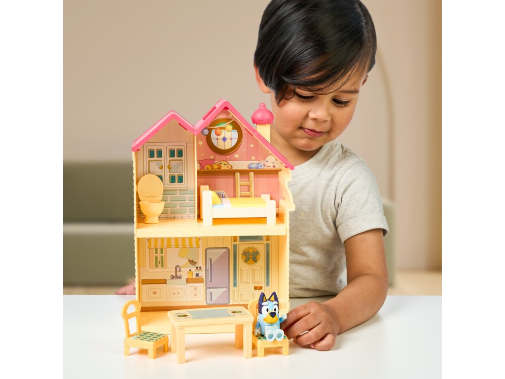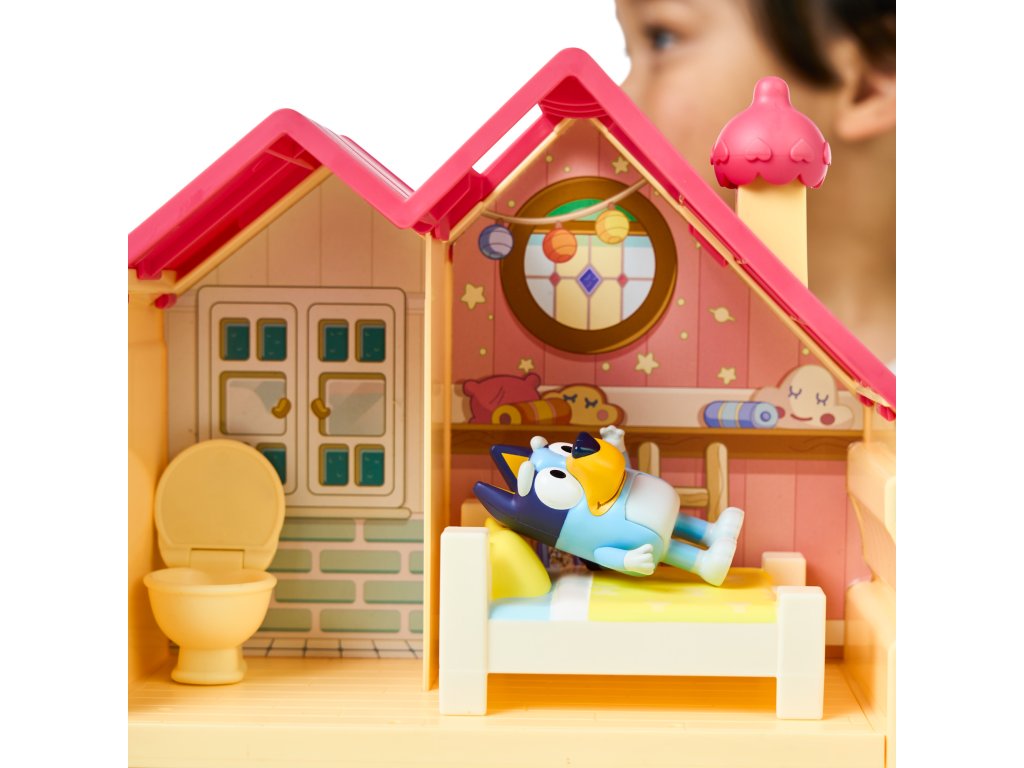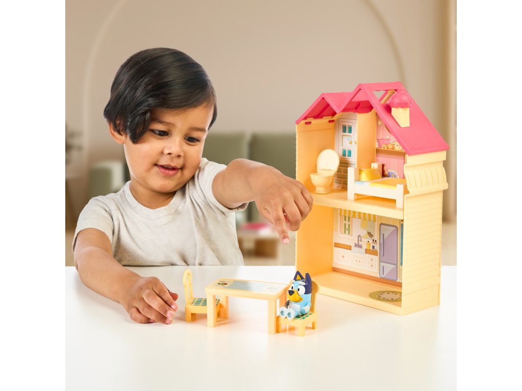 Hrací set Domček a figúrka Bluey Malý domček, veľká zábava: Bluey a jej príslušenstvo Objavte svet plný zábavy s Bluey a jej Mini domčekom! Tento kompaktný, no detailne prepracovaný domček ponúka tri izby – kuchyňu, spálňu a kúpeľňu – a je ideálny na hranie doma aj na cestách. Súčasťou je aj pohyblivá figúrka Bluey a päť kusov nábytku, ktoré podporujú kreativitu a rozvoj detskej predstavivosti.Preskúmaj každý kútik mini domčeka Mini domček s kuchyňou, spálňou a kúpeľňouPohyblivá figúrka Bluey (približne 6,35 cm)5 kusov nábytku: posteľ, stôl, 2 stoličky a toaletaPraktická rukoväť na jednoduché prenášanieVhodné pre deti od 3 rokovTento set je skvelým spôsobom, ako deti môžu znovu prežiť obľúbené scény zo seriálu alebo si vytvoriť vlastné príbehy s Bluey a jej rodinou.Dodatočné parametre