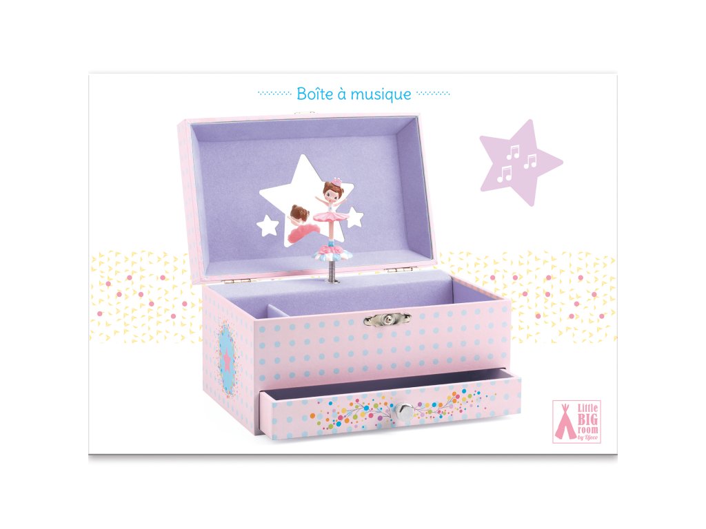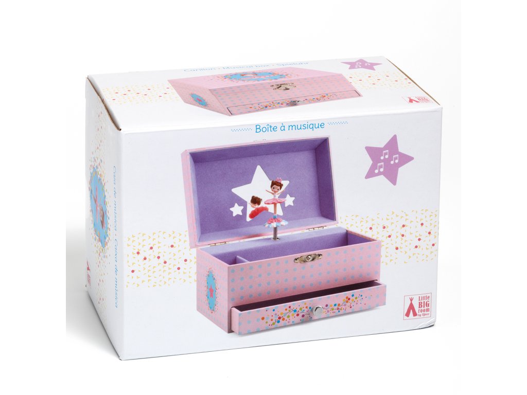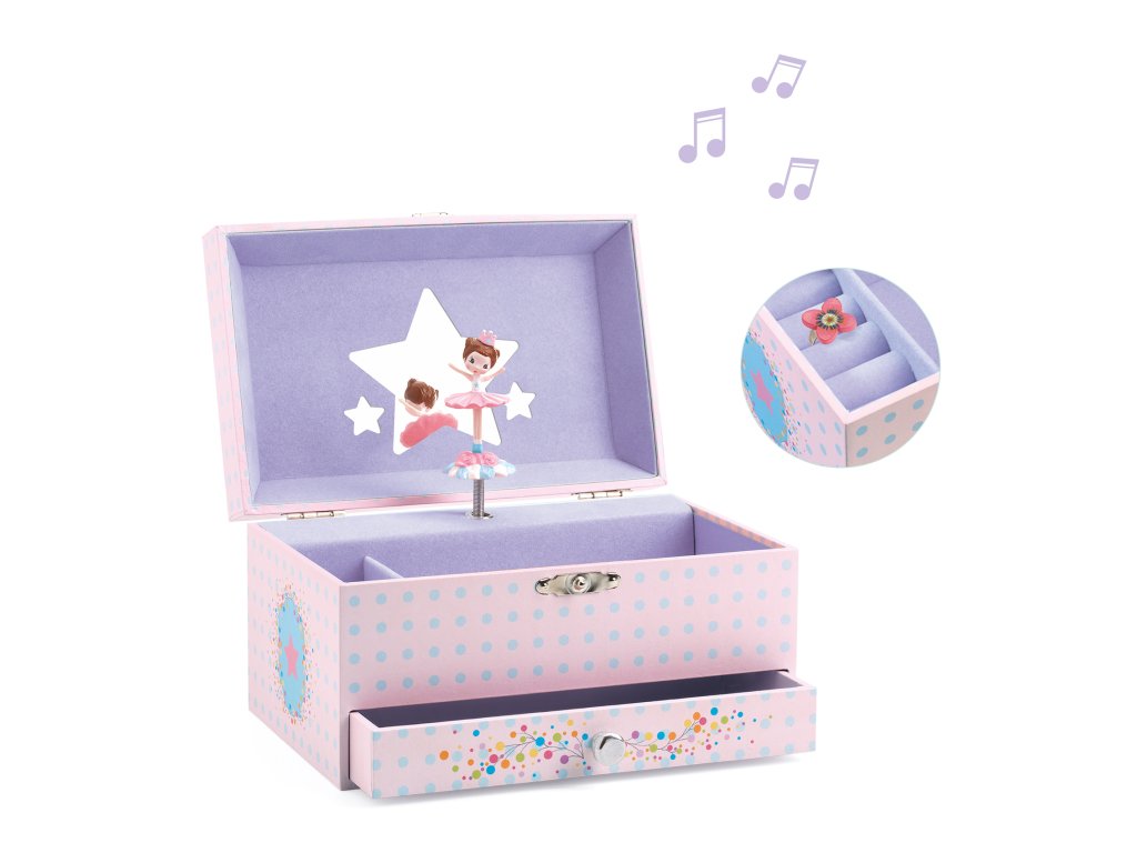 Hracia skrinka Baletka Ružová Ružová hracia skrinka s baletkou. Prekrásna šperkovnica alebo skrinka na iné poklady pre malé parádnice s motívom baletky. Vo vnútri sa nachádza niekoľko priehradok, zrkadlo v tvare hviezdičky a baletka.Hudobná skrinka s krásnou melódiou valčíka. Po otvorení hracej skrinky začne baletka svoj tanec v doprovode melódie valčíka od Carla Maria von Webera. Nádherný darček pre malé dievčatá či už k narodeninám alebo k inej príležitosti.Rozmer: 17,8 x 11,7 x 10,3 cm