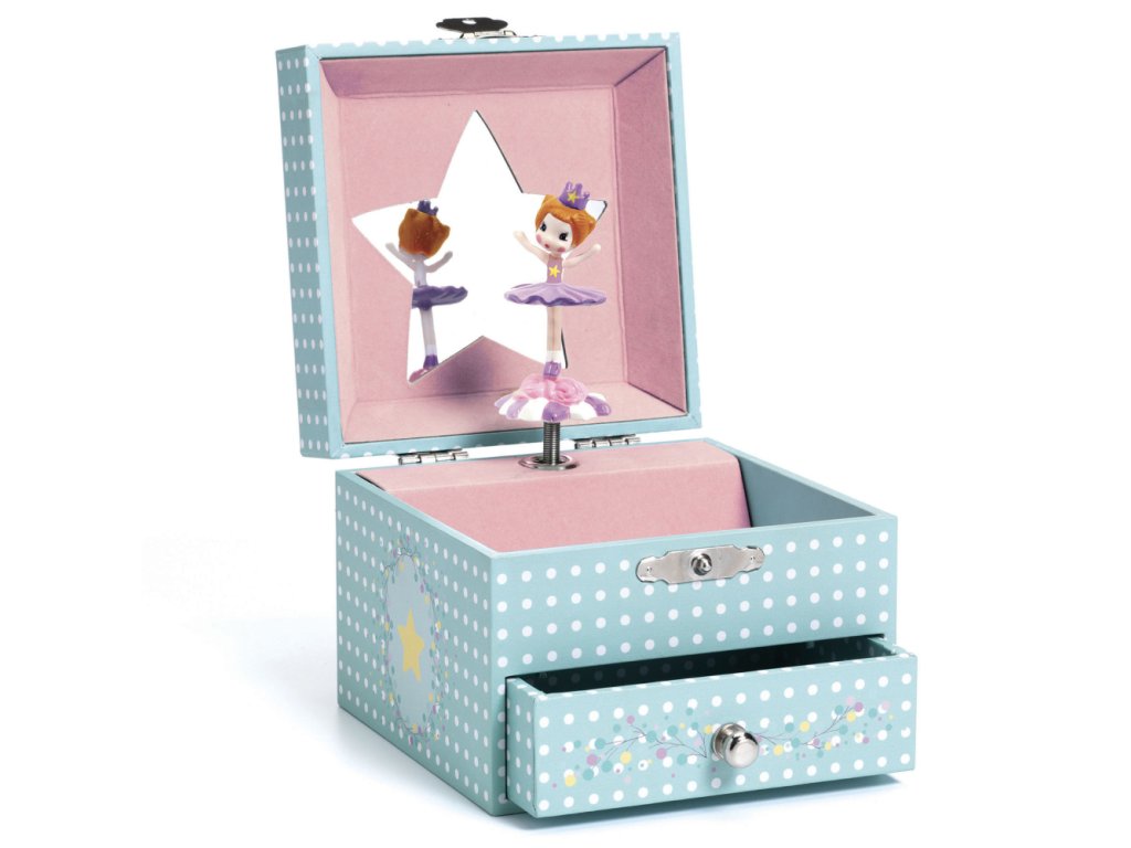 Hracia skrinka Baletka Zelená Hracia skrinka s ladnou figúrkou malej baleríny vo vnútri. Natiahnutím skrutky a otvorením veka sa spustí melódia Vyzvanie do tanca (C. M. von Weber) a roztočí sa figúrka. Figúrka sa zrkadlí v zrkadielku na vnútornej strane veka. Do priečinka a spodnej zásuvky si môžeš odložiť pokladíky alebo šperky.Skrutka na natiahnutie mechanizmu je na zadnej strane skrinky. Mechanizmus sa zastaví po určitej dobe alebo ho prerušíš zatvorením veka. Vnútro skrinky je potiahnuté mäkkým zamatom. Skrinka je drevená, polepená ilustrovaným papierom s obrázkom pôvabnej baleríny a ďalšími sladkými motívmi.Trvanie melódie: cca. 2,5 min.Rozmery: 10,5 x 10,5 x 8,5 cmRozmery balenia: 11 x 12 x 9 cmDodatočné parametre