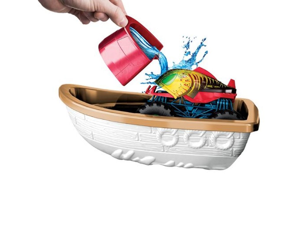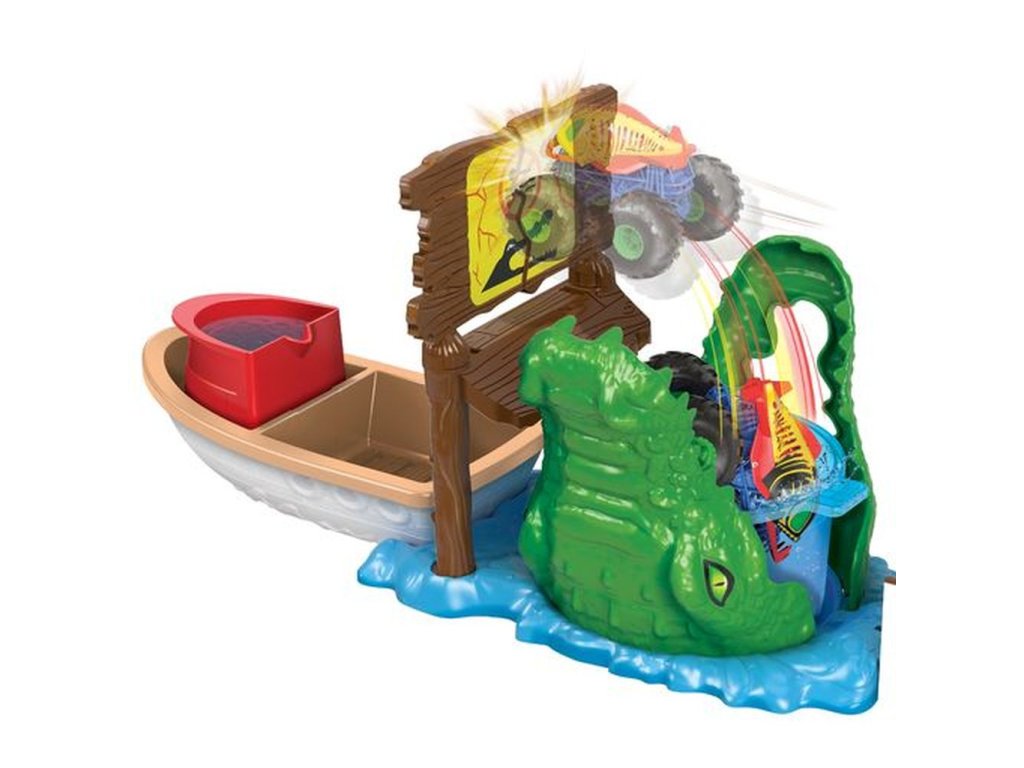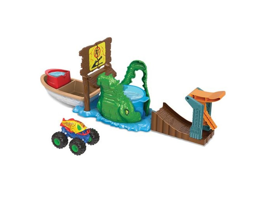 Herný set Hot Wheels® Monster Trucks Color Shifters™ Zúrivý krokodíl prináša rozbíjanie a búranie s vlnou prekvapení v podobe zmeny farieb a obrovské emócie k tomu! Spustite priložený monster truck Color Shifters™ do krokodílej papule plnej ľadovej vody a sleduj farebnú transformáciu, ktorá dodá trucku úplne nový vzhľad. Opätovným spustením trucku ho pošleš preraziť ceduľu a dostať sa na loď, kde ho môžeš poliať teplou vodou a znova zmeniť jeho farbu! Opakovaním kaskadérskych kúskov sa zmeny vzhľadu opakujú! Odnímateľný čln a kelímok v krokodílej papuli zabraňujú rozliatiu vody a udržujú hrací priestor čistý. Farby a vzhľad výrobku sa môžu líšiť.Dodatočné parametre