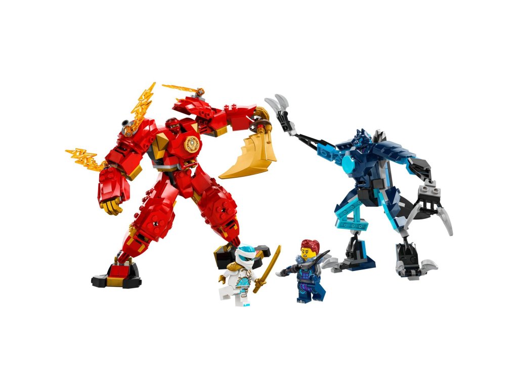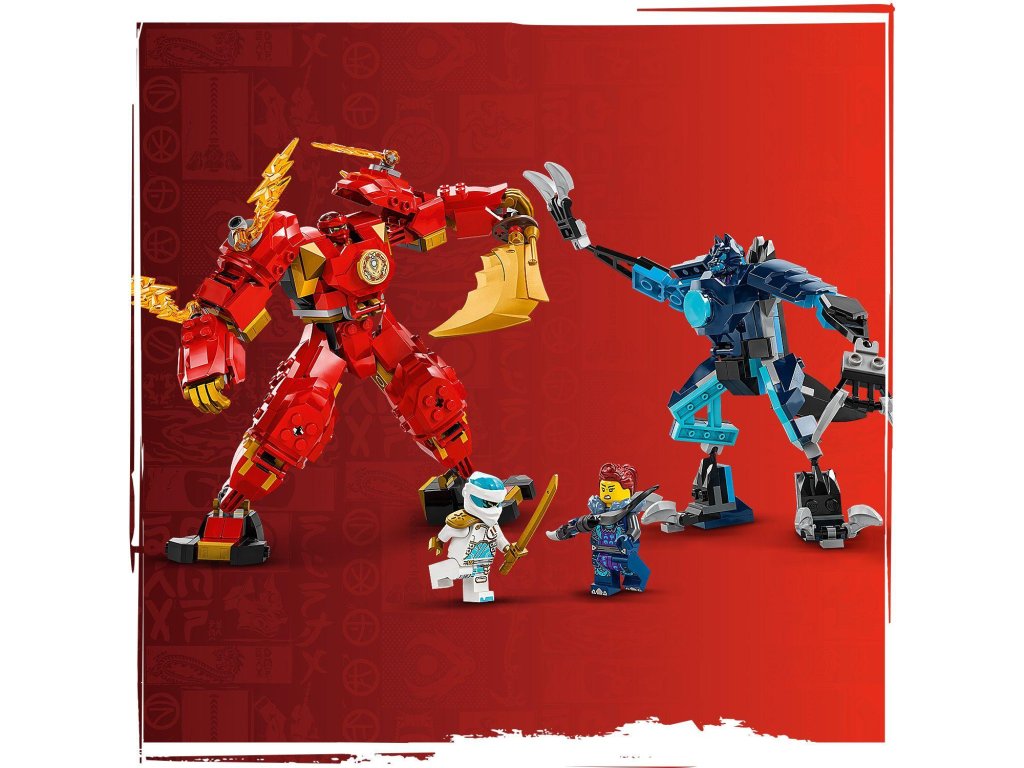 Deti od 7 rokov si môžu zinscenovať príbehy z 2. série televízneho seriálu NINJAGO® Dragons Rising s hračkárskym modelom Kaiov živelný ohnivý robot (71808). Robot má polohovateľné ruky a nohy, ktoré sa dajú nakláňať a krútiť do dramatických bojových polôh, kokpit pre minifigúrku nindžu a veľký zlatý meč ako doplnok na hru na postavy v bitkách proti vlčiemu robotovi. Tento prispôsobiteľný robot umožňuje deťom postaviť si vlastného robota! Jeho odnímateľné nohy, ruky a trup sa dajú kombinovať s dielmi z 2 ďalších robotov: Coleov živelný zemský robot (71806) a Sorin živelný technický robot (71807) (predávané samostatne). Deti si môžu užiť nekonečnú zábavu pri kombinovaní častí robota a budovaní jedinečnej akčnej hračky. Tento červený robot sa dodáva s 4 minifigúrkami – Kaiom a Zaneom s prvkami mečov katana, Jordanou s prvkom meča a Bojovníkom vo vlčej maske, takže deti si môžu zahrať napínavú nindžovskú akciu. Stavebnicu možno zostaviť aj pomocou aplikácie LEGO® Builder, ktorá vás a vaše dieťa prevedie jednoduchým a intuitívnym staviteľským dobrodružstvom.Dodatočné parametre