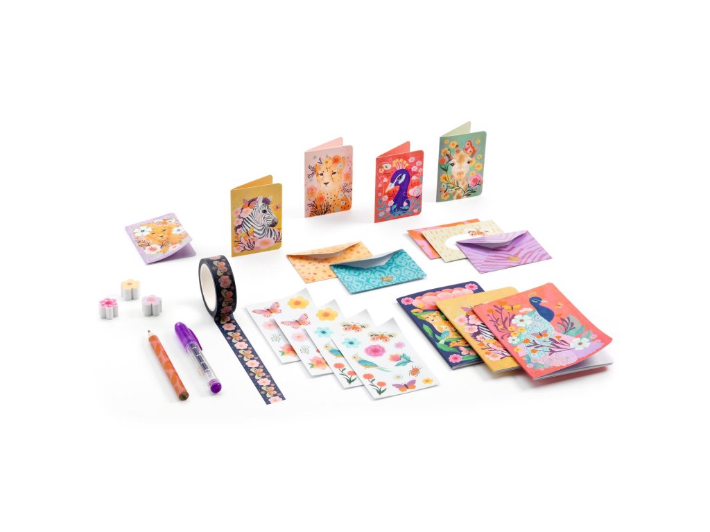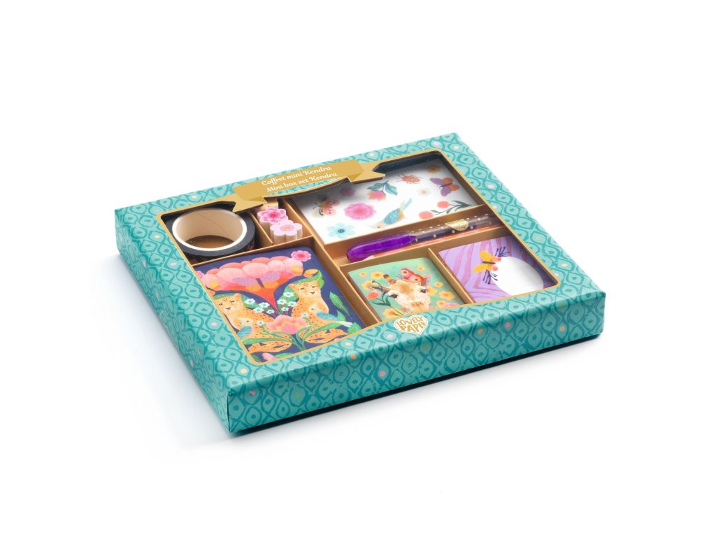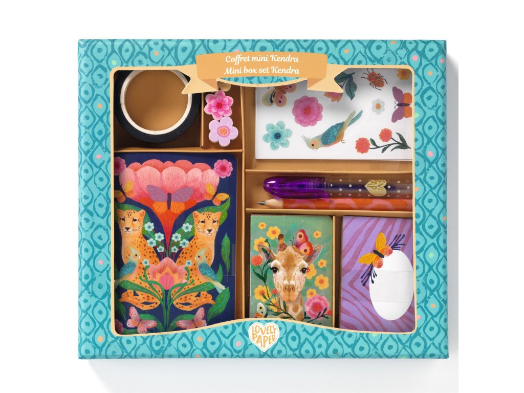 Kendra: Mini korešpondenčná a písacia sadaRoztomilá sada na písanie listov pre detiKendra – mini korespondenčná a písacia sada je krásna a praktická papierenská sada z kolekcie Lovely Paper, ktorá ponúka všetko potrebné pre písanie listov, pozdravov alebo krátkych správ.Prečo si vybrať sadu od Djecokompletná písacia sada pre listy a správyilustrované papiere a obálky pre originálne písaniedekoratívne samolepky na ozdobeniekrásny dizajn z kolekcie Lovely PaperObsah balenia3 mini zápisníky (10 čistých strán)5 mini kariet (rozmery: 4 x 6 cm)5 mini obálok4 hárky samolepiek (2 dizajny x 2 ks)kotúč ozdobnej lepiacej páskymini gélové peromini ceruzka3 mini gumy na gumovanieDodatočné parametre
