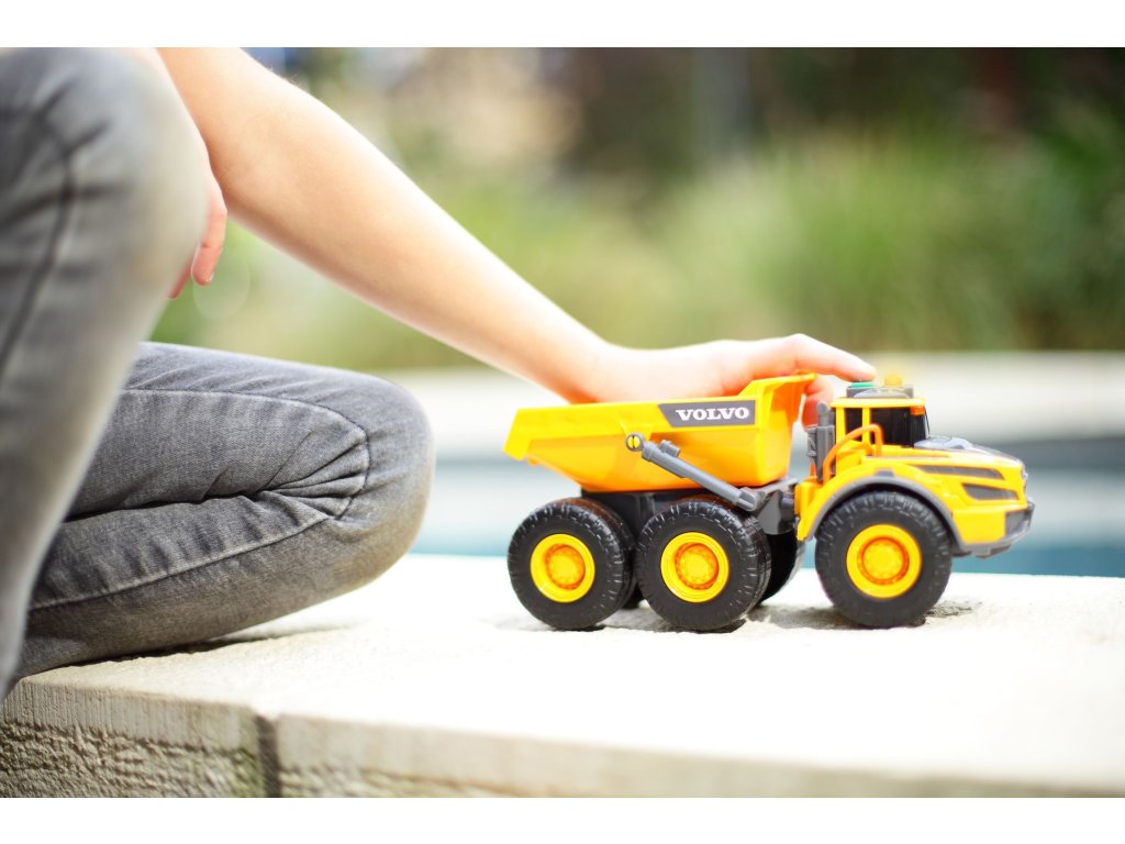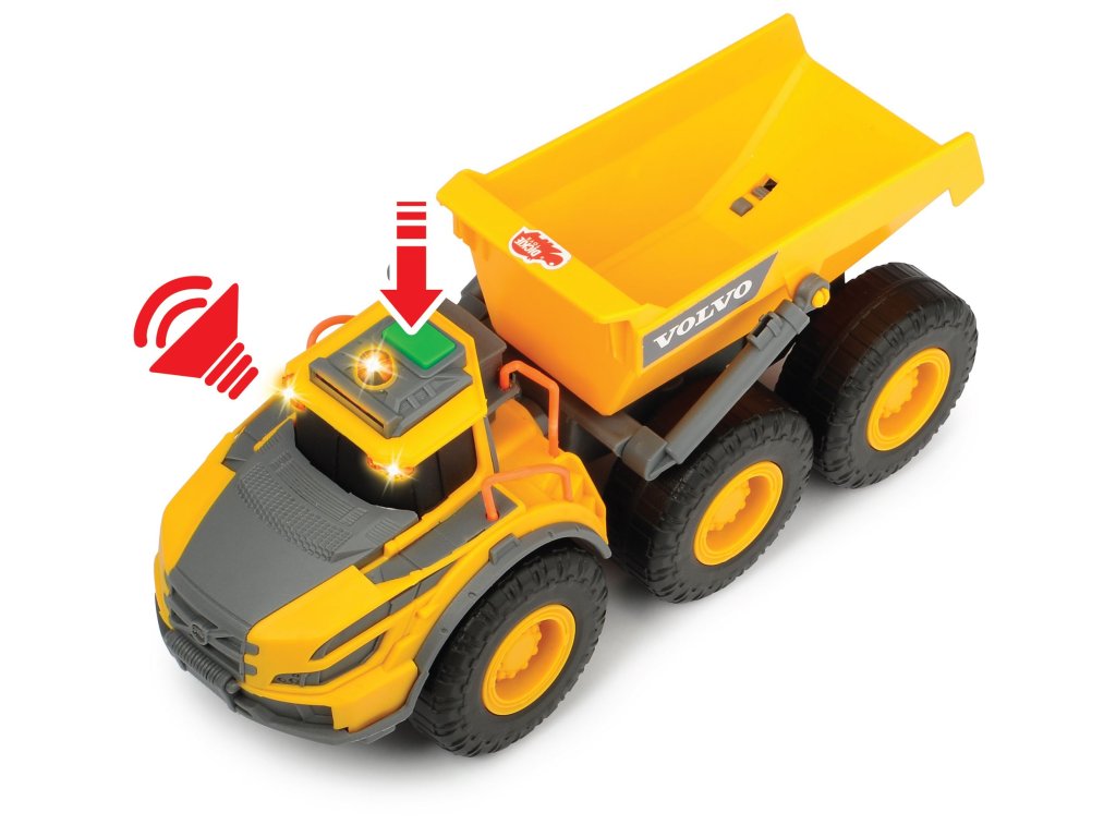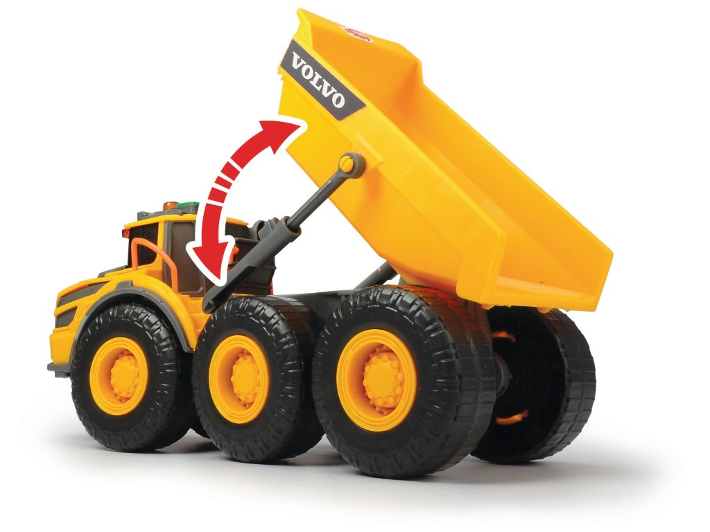 Kĺbové nákladné auto v licencii Volvo na voľnobeh, so svetelnými a zvukovými efektmi, manuálne pohyblivý nákladový priestor. Dĺžka 23 cm.Dodatočné parametre
