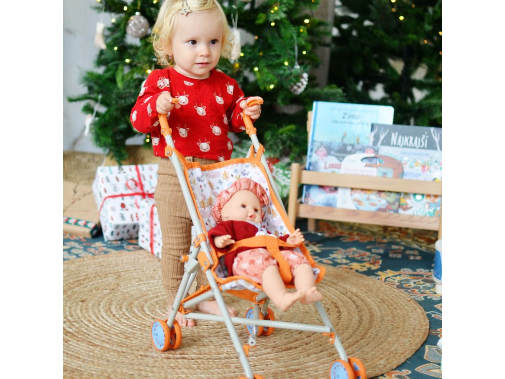 A ide sa na prechádzku s kočíkom! Golfový skladací kočík pre bábiky veľkosti 30-36 cm. Je ľahký, vhodný do interiéru, aj von. Sedaciu časť z bavlny s umývateľnou vrstvou zdobí milá jesenná potlač.Stabilný a bezpečný kočík je možné žložiť. Dodatočnú stabilitu kočíka zabezpečuje uzáver medzi zadnými kolieskami. Pre bábiky je pobyt na čerstvom vzduchu rovnako dôležitý ako pre deti :) Obsah: 1 skladací kočík. Rozmery: 26 x 54 x 25 cmDodatočné parametre