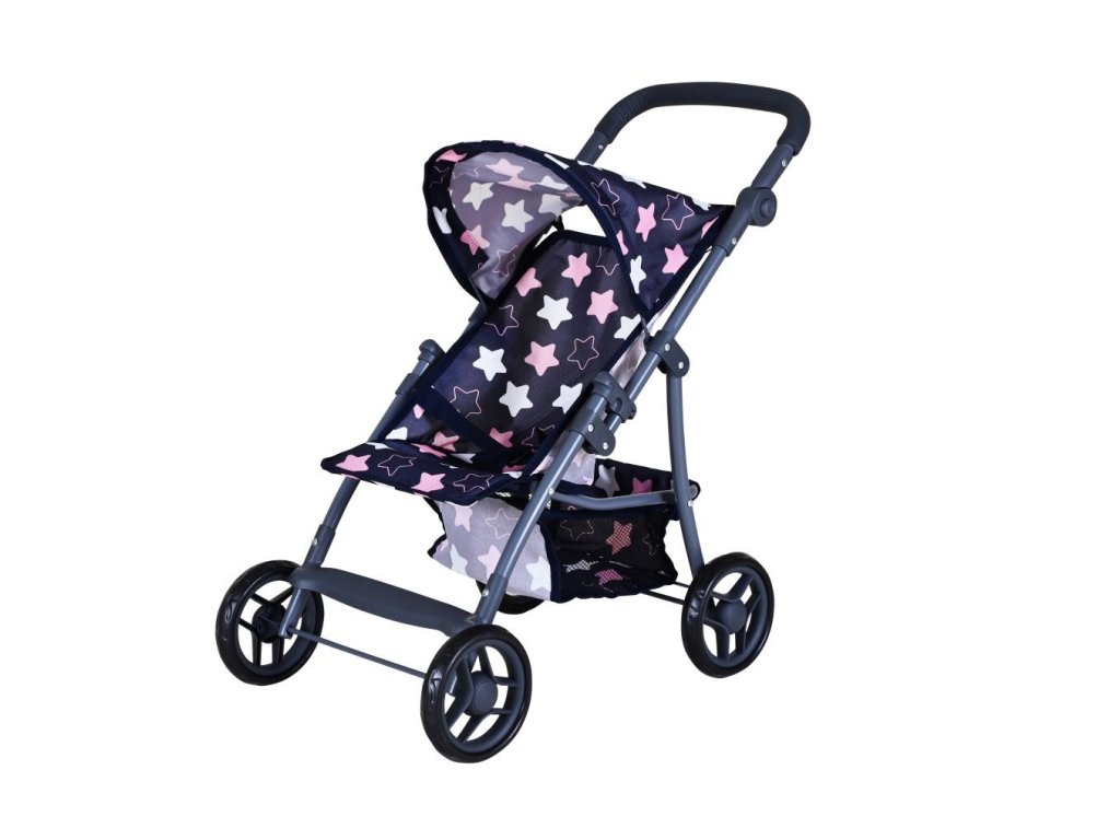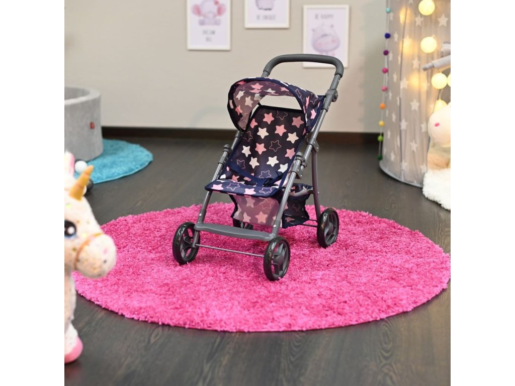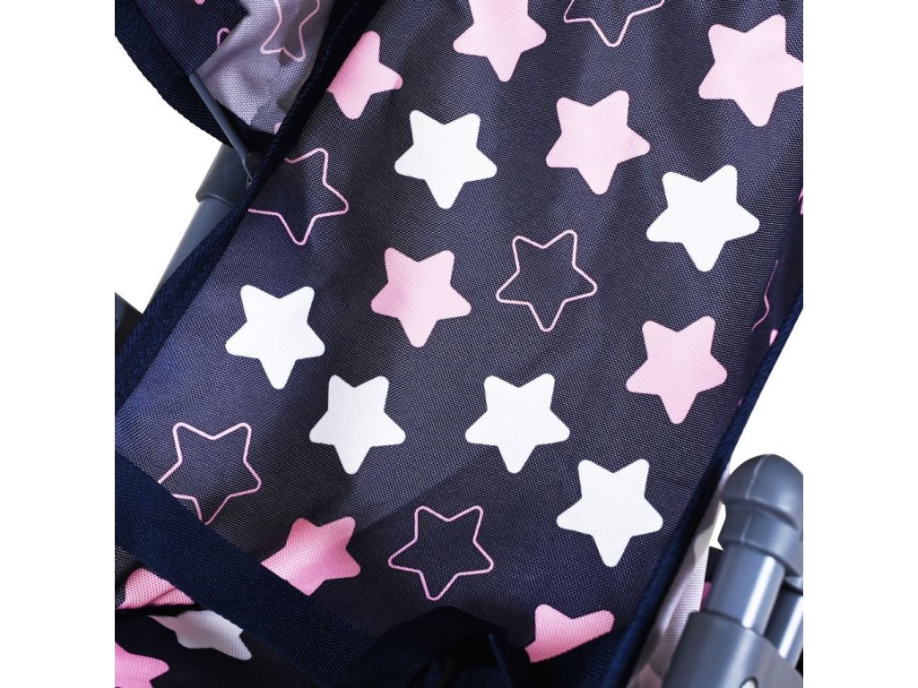 Očarujúci vzor bielych a ružových hviezd na tmavomodrom pozadí púta pozornosť. Nastaviteľná strieška chráni bábiku pred slnkom a vetrom. Vďaka použitiu praktických bezpečnostných pásov zostane hračka vždy na svojom mieste. Navyše, ľahký kočík s hmotnosťou približne 2 kg je vybavený praktickou nákupnou sieťkou, vďaka ktorej si dieťa môže vziať so sebou všetky potrebné doplnky, ako napríklad oblečenie, fľašu, cumlík alebo deku.