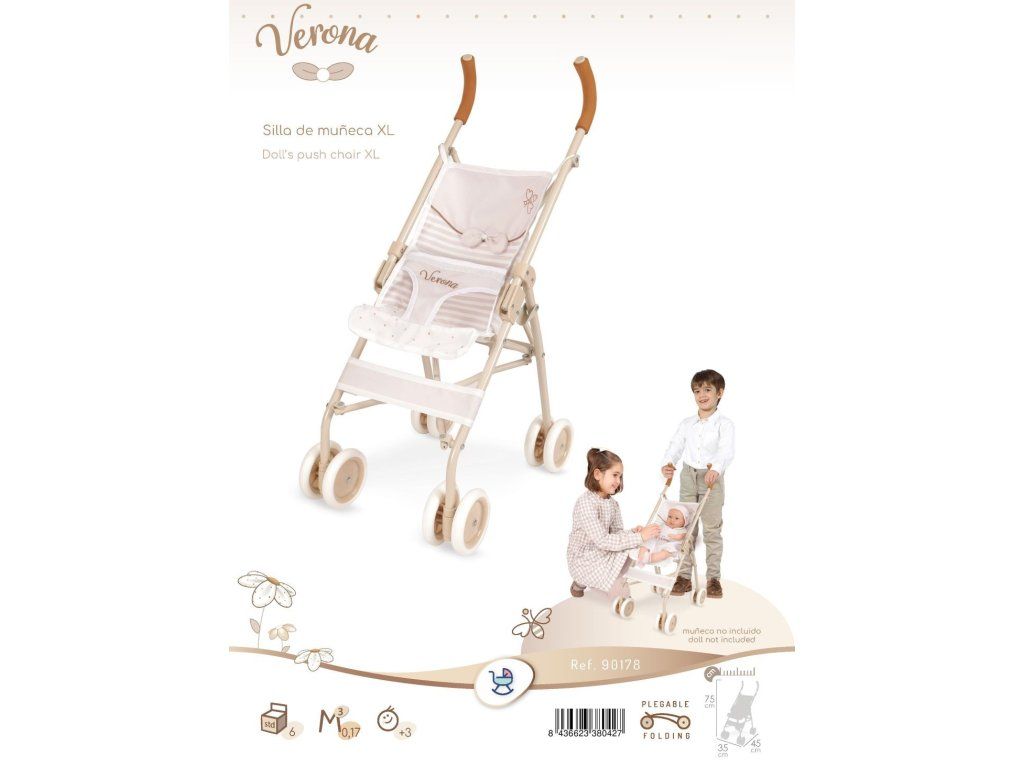 Každá kolekcia bábik sa stáva atraktívnejšou a povzbudzuje k aktívnej hre doma aj vonku, ak ju obohatíme o originálne a funkčné doplnky. Štýlovo navrhnutý, veľký kočík pre bábiky dodá interiéru detskej izby jedinečný akcent. Kolekcia Verona od renomovanej španielskej značky DeCuevas bola inšpirovaná Veronou, ktorá sa spája s ľúbostným príbehom z hry Williama Shakespeara „Rómeo a Júlia“. Vyznačuje sa jemnými odtieňmi béžovej a hnedej. Jarné detaily ako kvety a včely, ako aj decentné a univerzálne dekorácie. Dieťa si môže vziať na prechádzku alebo na výlet bábiku s výškou až 52 cm. Ľahký, skladací model sa ľahko prepravuje a pohodlne používa. Odporúčame pre deti od 3 rokov.