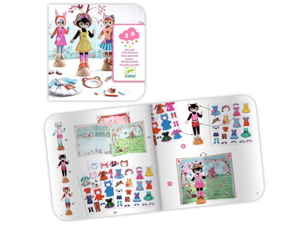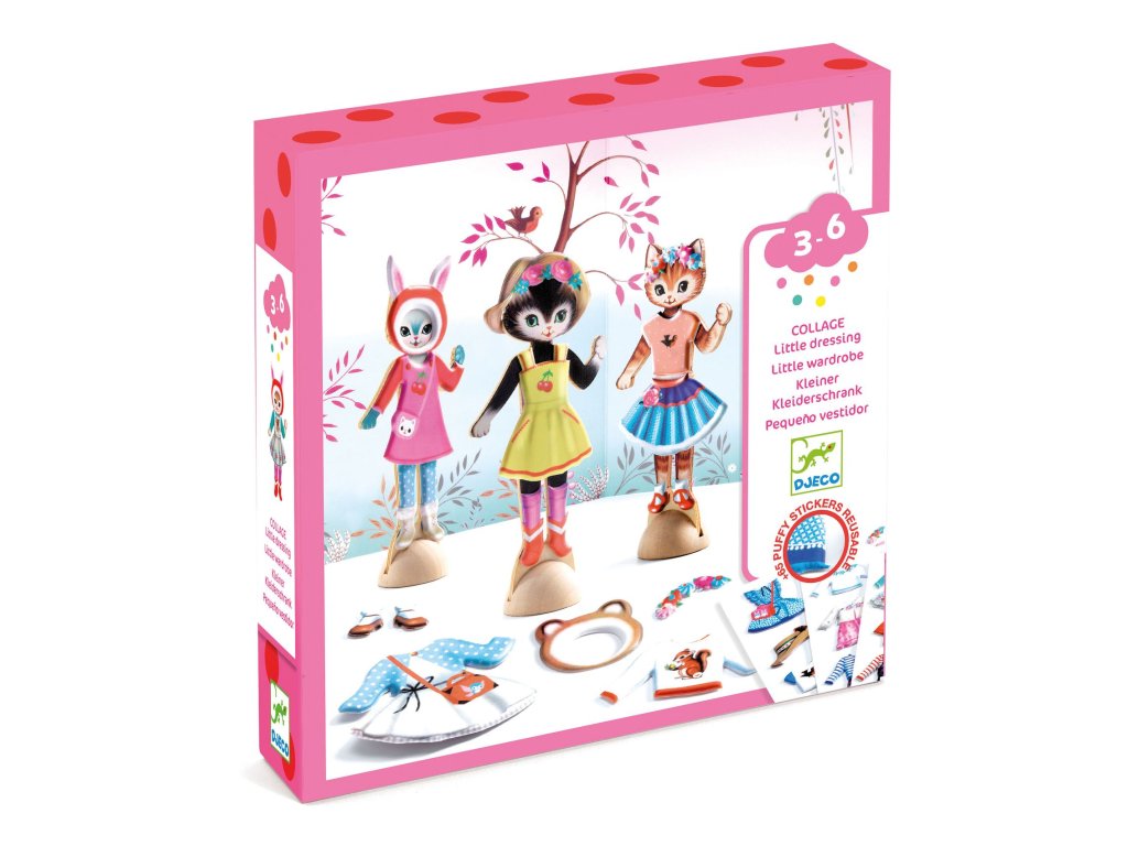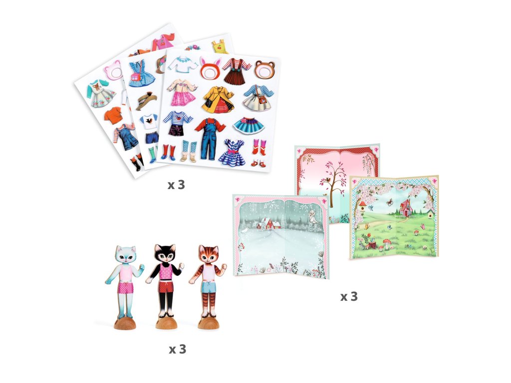 Koláž: Obliekanie 3 mačiekZábavné obliekanie drevených mačičiek opakovane použiteľnými samolepkamiKreatívna sada Koláž: Obliekanie 3 mačiek od značky Djeco prináša deťom hravú kolážovú aktivitu, pri ktorej môžu obliekať 3 drevené mačky pomocou odnímateľných a opakovane použiteľných odolných samolepiek. Deti tak kombinujú oblečenie podľa vlastnej fantázie na rôzne scény a vytvárajú originálne módne kreácie pre mačičky. Sada obsahuje 3 drevené mačky so stojanmi, 3 ilustrované pozadia z ekologickej FSC® lepenky a viac ako 45 dielikov oblečenia a doplnkov, ktoré sa dajú neustále meniť a presúvať.Výhody tejto tvorivej sadyJednoduché a hravé obliekanie mačičiek podľa vlastnej fantázieOpakovane použiteľné odolné samolepky – deti môžu oblečenie meniť znova a znova3 drevené figúrky so stojanmi a 3 farebné pozadiaRozvoj kreativity, jemnej motoriky a farebného cíteniaEkologický materiál s certifikátom FSC®Pre koho je sada vhodnáTento kreatívny kit je odporúčaný pre deti od 3 rokov a skvele poslúži ako tvorivá zábava doma, v škôlke aj na cestách.Dodatočné parametre