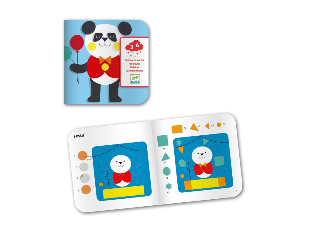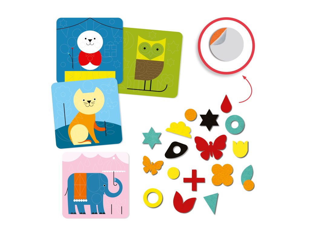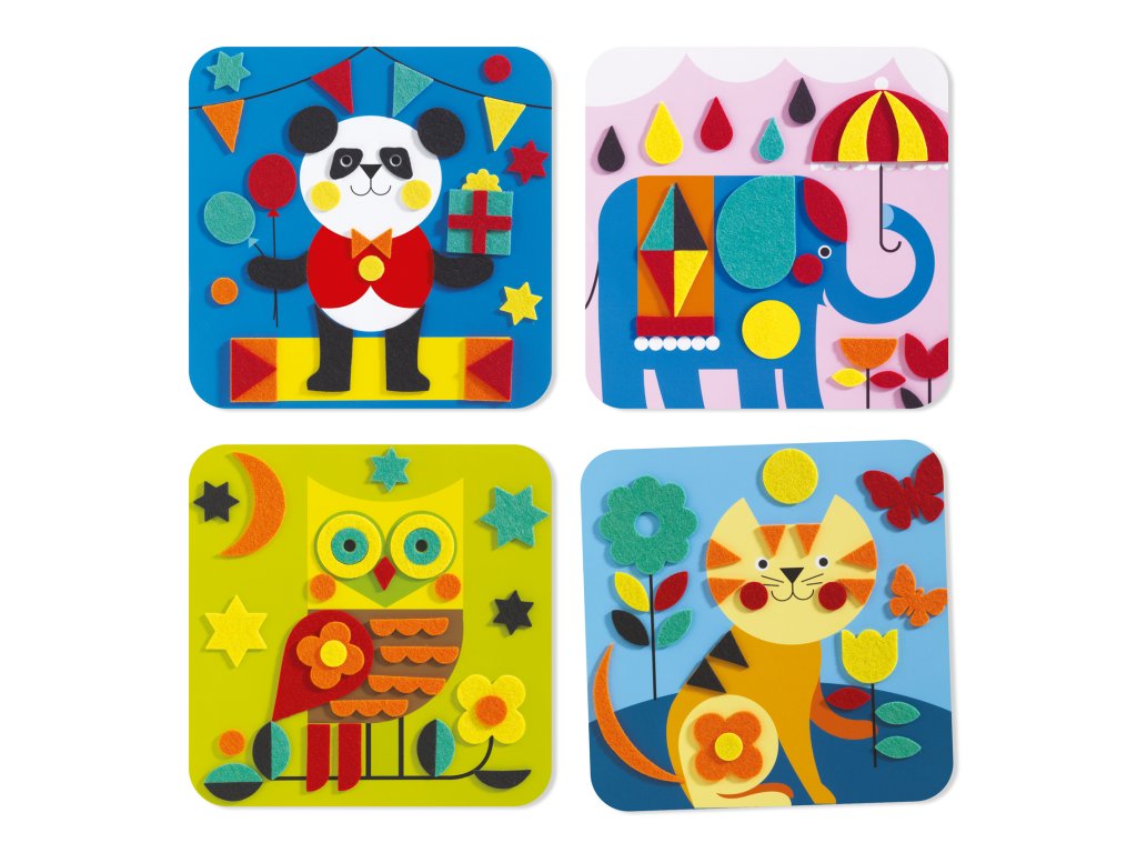 Koláže s filcovými samolepkami. Veselé tvorenie so samolepkami rôznych tvarov bude deti baviť.Vyskladajte si zvieratká z mäkkého filcu. S touto sadou si vytvoríte 4 obrázky, ktoré znázorňujú zvieratká s milým gestom. Mačka a sova darujú kvietok, panda balóny a darček k oslave narodenín, slon podrží v daždi dáždnik. K takémuto peknému správaniu sa hodia pekné výrazné farby. Obrázky sú čiastočne ilustrované a vašou úlohou je doplniť ich na vyznačených miestach filcovými samolepkami. Hotové obrázky môžete podarovať alebo si nimi skrášliť izbu.Dodatočné parametre