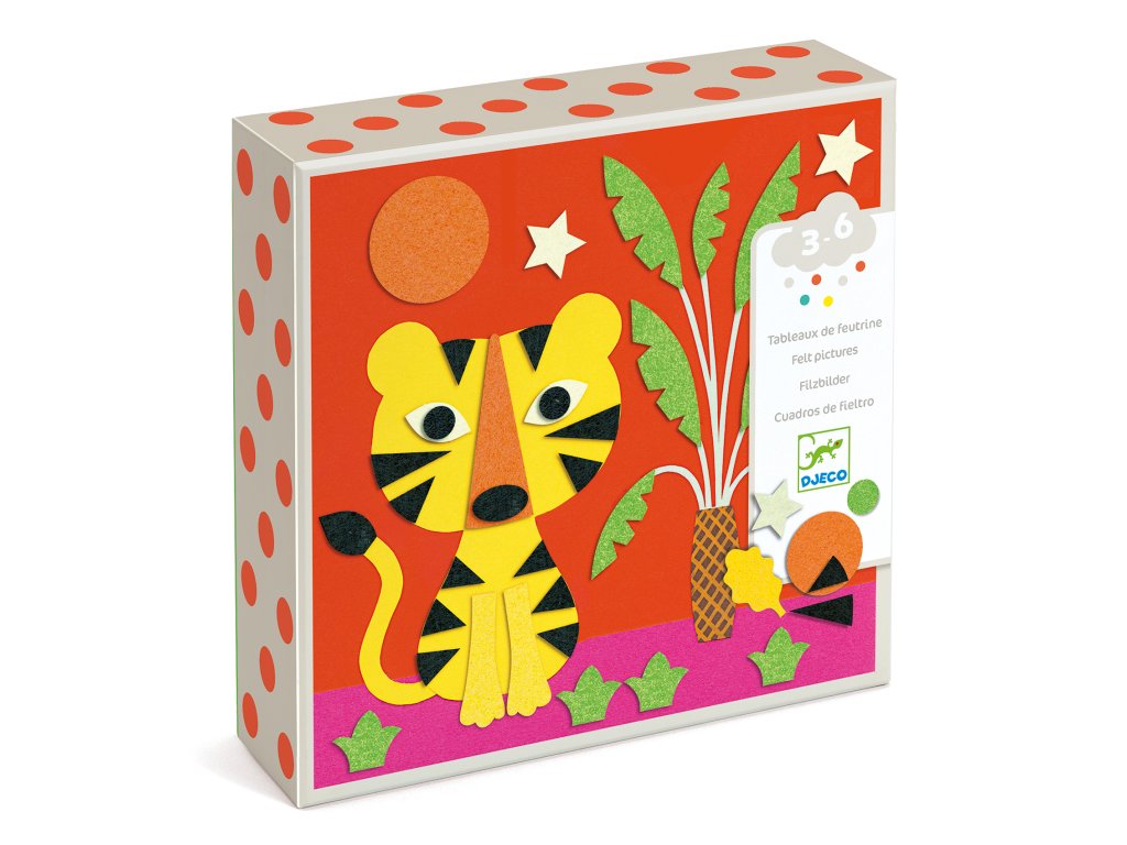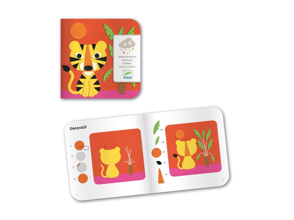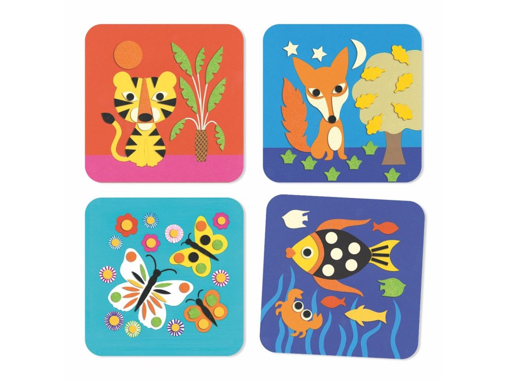 Tvorivá sada koláže pre malých umelcov. Kreatívna sada, s ktorou majú menšie deti možnosť vyskúšať si výtvarnú techniku koláž. Vyskladajte si zvieratká z mäkkého filcu. Sada obsahuje 4 predlohové karty s obrázkom tigríka, motýľov, rybiek a líštičky (200 x 200 mm), 114 samolepiek rôznych tvarov v 5 farbách, obrázkový návod. Príroda hýri rôznymi farbami a tvarmi a dieťa si ich v koláži môže skombinovať podľa vlastnej fantázie alebo skúsi postupovať podľa návodu. Dieťa môže hotové obrázky podarovať alebo si nimi skrášliť izbu.Dodatočné parametre