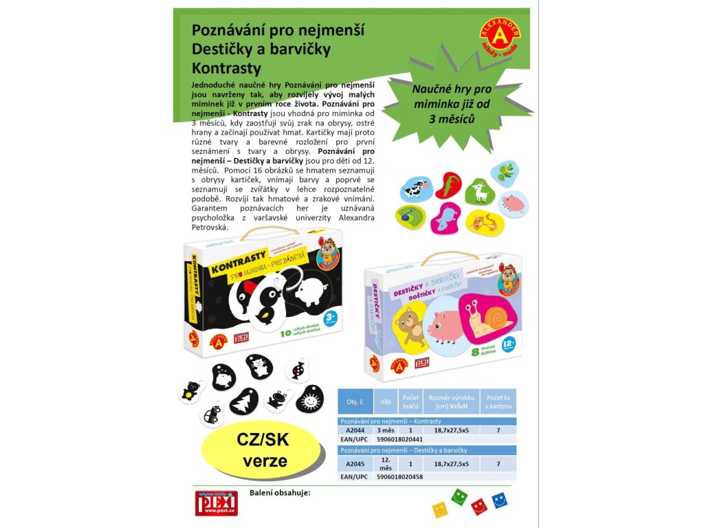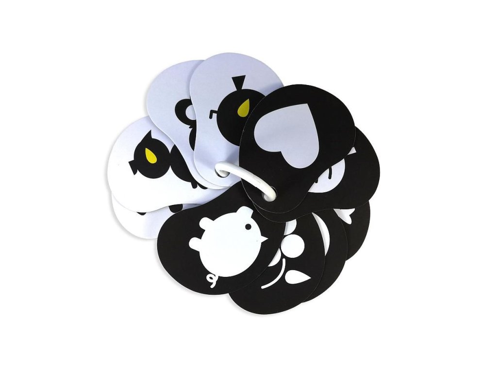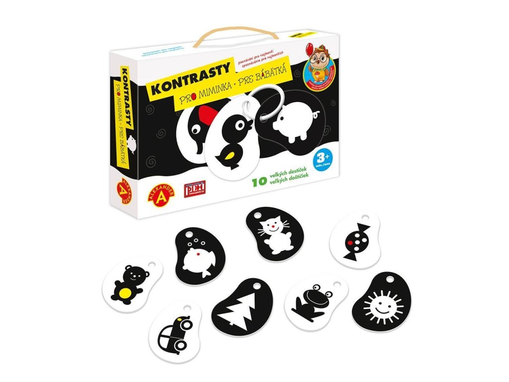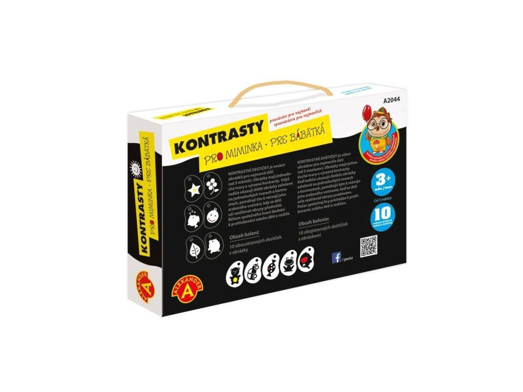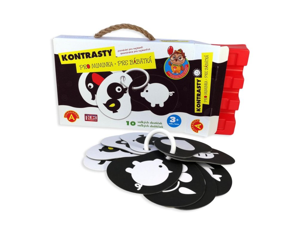Kontrasty sú vhodné pre bábätká od 3 mesiacov, kedy zaostrujú svoj zrak na obrysy, ostré hrany a začínajú používať hmat. Kartičky majú preto rôzne tvary a farebné rozloženie pre prvé zoznámenie s tvarmi a obrysy.Dodatočné parametre