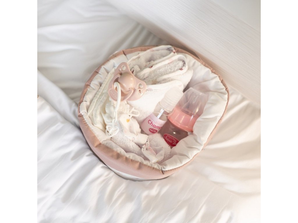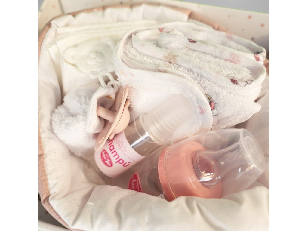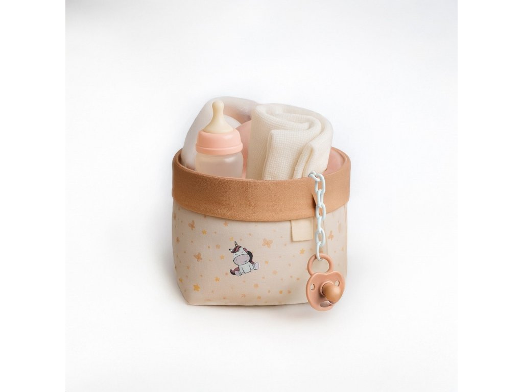 Biely a béžový mäkký košík s jednorožcami na doplnky pre bábiky je jedinečná hračka z kolekcie španielskych bábik Antonio Juan. Bol určený pre deti do 3 rokov a je vyrobený kompletne v Španielsku.