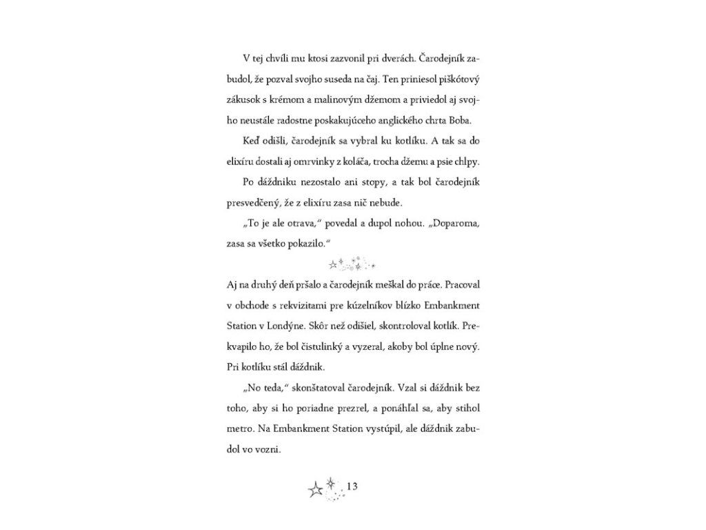 Kúzelný Bob Dáždnik, aký svet ešte nevidelZoznámte sa s Bobom – najbláznivejším dáždnikom, akého ste kedy videli! Má hlavu psa, vie rozprávať, myslieť aj cítiť a navyše oplýva množstvom magických schopností. Napriek svojej výnimočnosti strávi dlhých päť rokov v oddelení strát a nálezov, kde potichu sníva o jedinom – nájsť niekoho, kto ho bude mať naozaj rád.Všetko sa zmení vo chvíli, keď ho objaví dievčatko Sylvia Mesačná a rozhodne sa vziať si ho domov. Bob má pocit, že sa mu splnil najväčší sen. No svet je plný ľudí, ktorí túžia vlastniť čarovné veci, a práve oni Bobovi jeho šťastie vezmú. Dáždnik sa ocitá ďaleko od Sylvie a musí čeliť nebezpečenstvám aj vlastným obavám.Podarí sa Bobovi prekonať všetky prekážky a vrátiť sa tam, kam patrí – domov k Sylvii? Príbeh Kúzelného Boba je dojímavým rozprávaním o priateľstve, odvahe a sile lásky, ktorá dokáže prekonať aj tie najmocnejšie kúzla.Dodatočné parametre