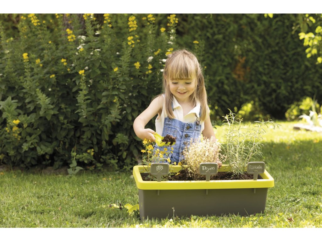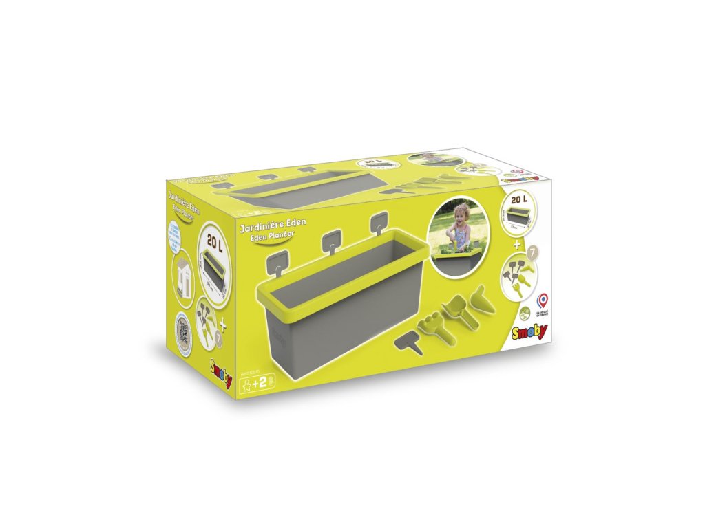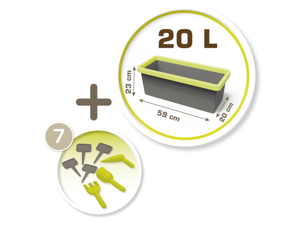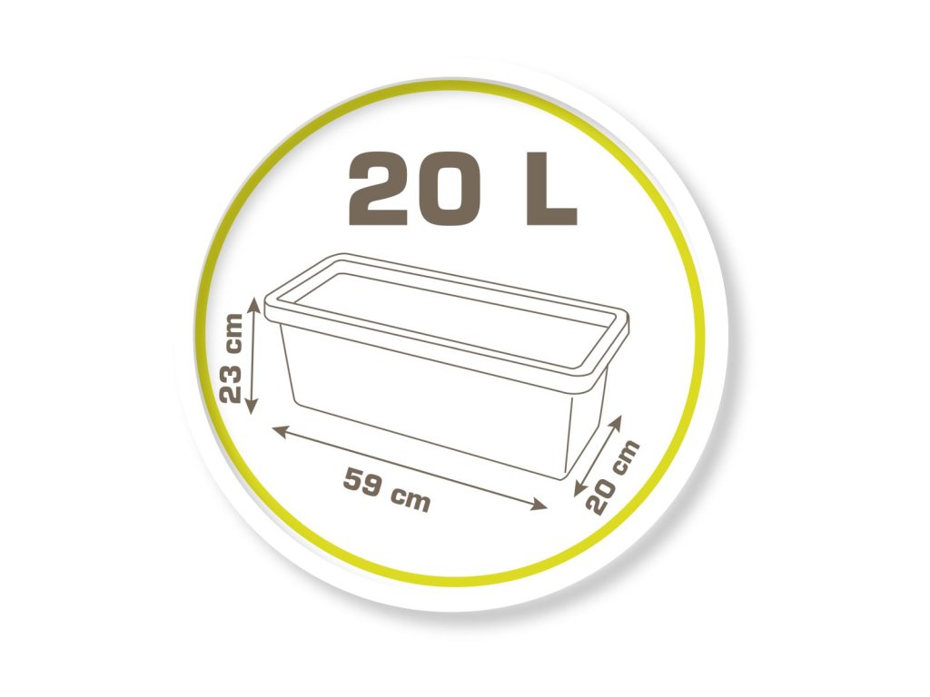 Hrantík na kvety alebo zeleninu, obsah 20 litrov. Súčasťou 4 zapichovacie značky, vypichovák, hrabličky a lopatička. Zóna zadržiavajúca vodu, dno je možné navŕtať podľa potreby. Rozmery kvetináča 59 x 21,5 x 24 cm.