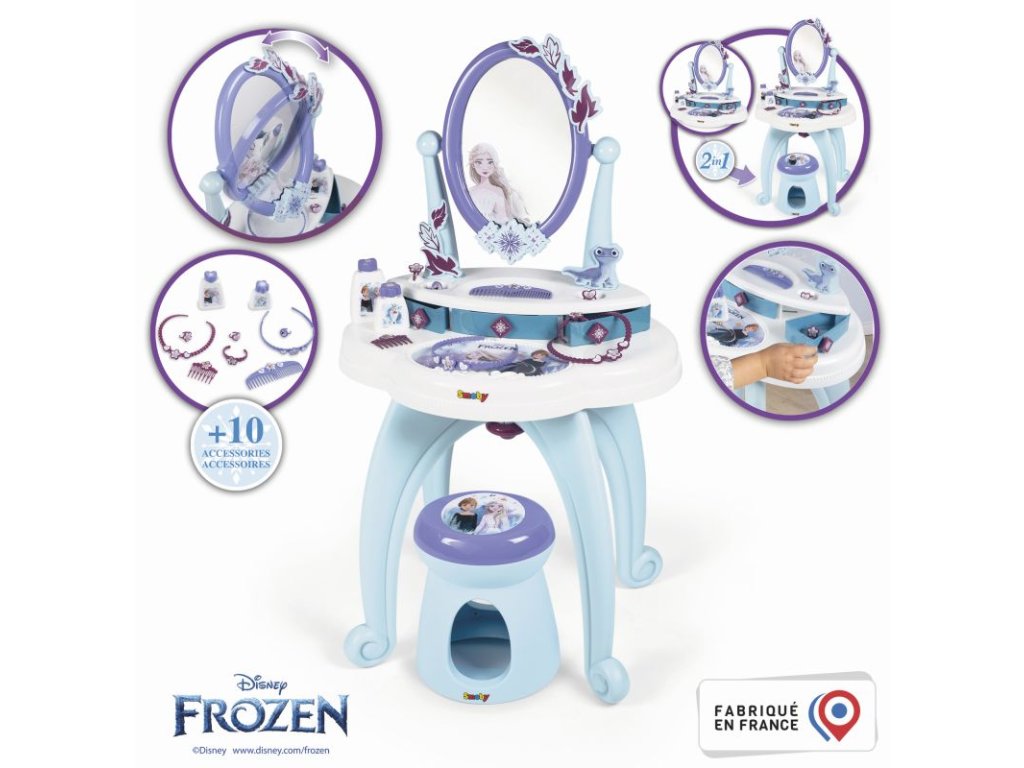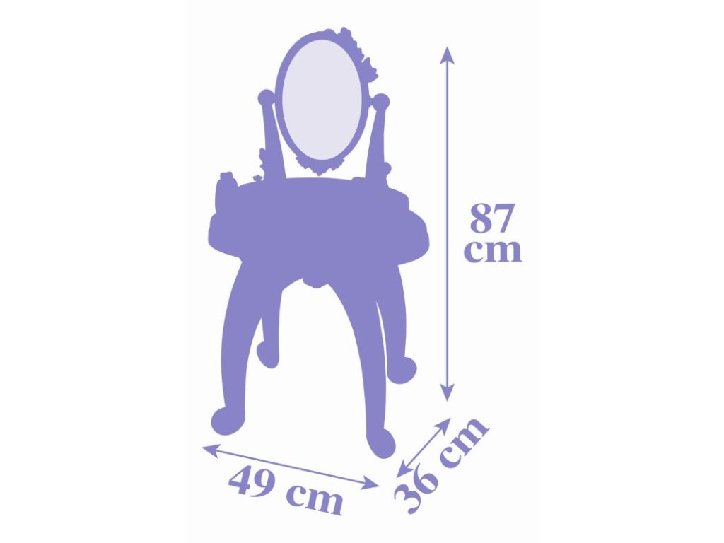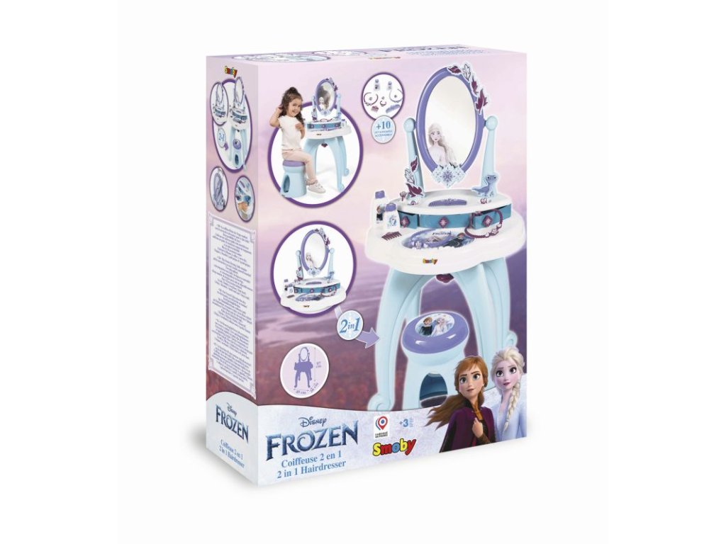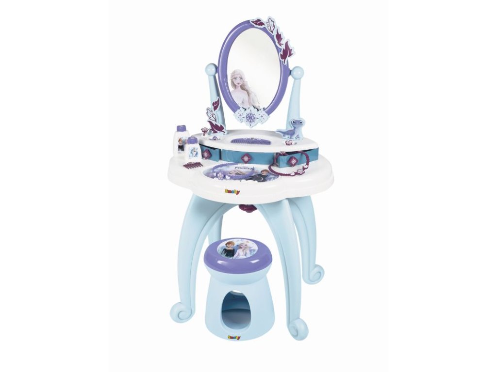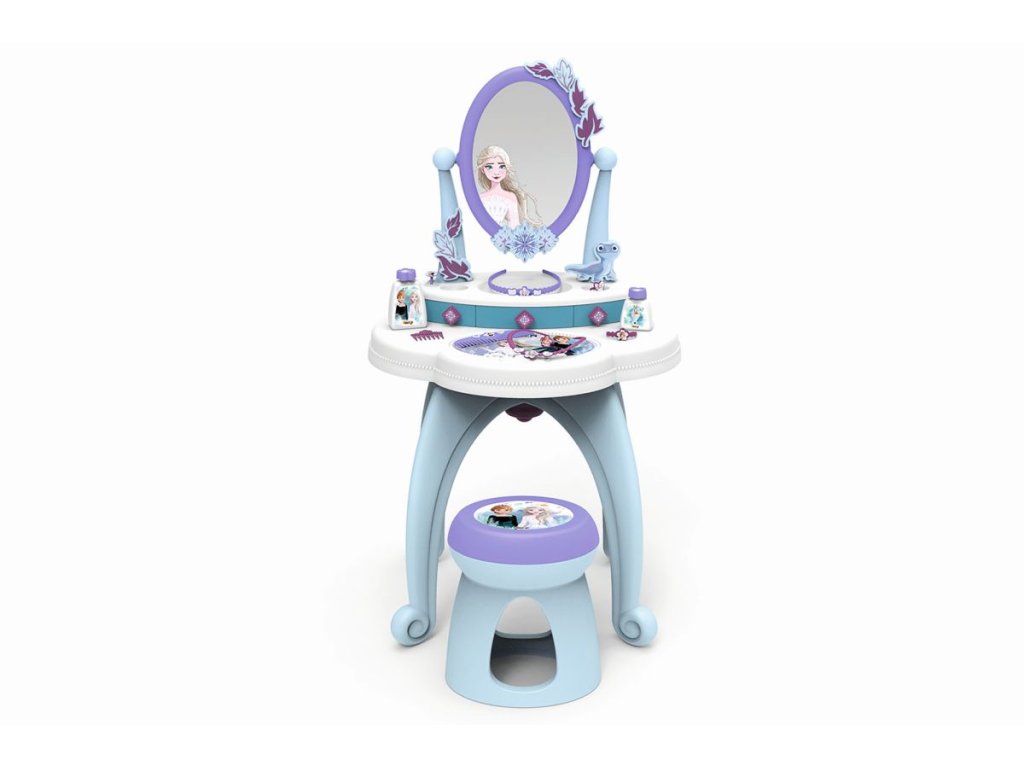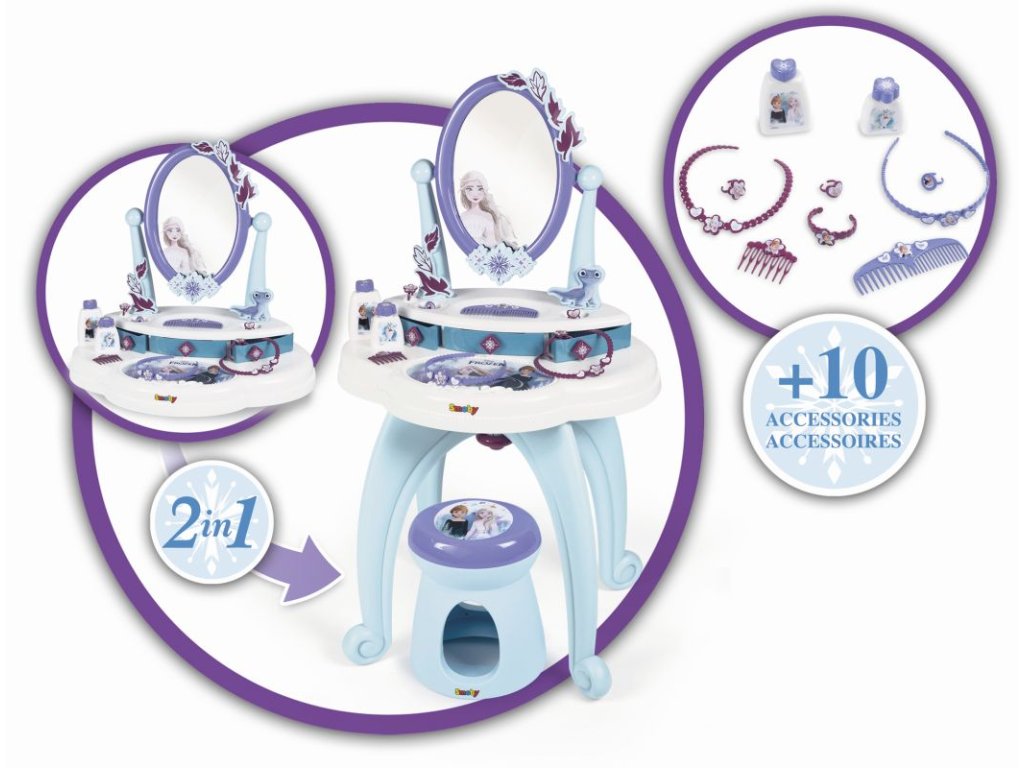 Robustný toaletný stolík so stoličkou a s veľkým otočným zrkadlom je navrhnutý v obľúbených farbách ľadovej kráľovnej Elsy a jej sestry Anny. Súčasťou sú fľaštičky na parfumy, hrebeň, čelenka, náhrdelník, hrebeň do vlasov, náramok a 3 prstene. Početné odkladacie plochy sú praktické a je možné ich využiť na uloženie všetkého príslušenstva. Všetky použité materiály spĺňajú najvyššie požiadavky na kvalitu pre dlhú a bezstarostnú hernú zábavu. Rozmery produktu (D׊×V): 49 × 36 × 87 cm.Dodatočné parametre