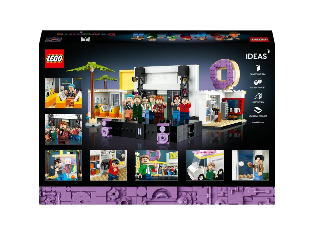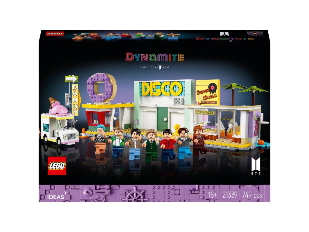 Zachyťte radostnú energiu, ktorú prinášajú popové ikony 21. storočia: RM, Jin, SUGA, j-hope, Jimin, V a Jung Kook v stavebnici k hudobnému klipu LEGO® Ideas 21339 BTS Dynamite. Pri stavaní si pripomeňte farebné scény z klipu k ich multiplatinovému singlu Dynamite, nájdete tu aj LEGO verziu diskotéky, obchodu s platňami, predajne šišiek či zmrzlinárskeho auta a množstvo ďalšieho. Položte LEGO minifigúrky jednotlivých členov skupiny na rôzne miesta, alebo ich všetky umiestnite na špeciálne pódium a otáčajte kolieskom, aby začali tancovať. Presne ako hudobný klip Dynamite Tento model na hranie aj vystavenie predstavuje skvelý darček pre všetkých fanúšikov BTS. Stavebnica je plná autentických detailov vrátane platní BTS v obchode s platňami, zostaviteľných paliem a basketbalového koša pred pomaľovanou stenou. V krabici aj v aplikácii LEGO Builder nájdete návod, ktorý vás prevedie jednotlivými krokmi tohto zábavného stavania. Vitajte vo svojom živle Preskúmajte stavebnice LEGO pre dospelých, vybranú kolekciu pútavých modelov. Nech sa už zaujímate o čokoľvek, určite tu nájdete stavebnicu aj pre vás.Dodatočné parametre