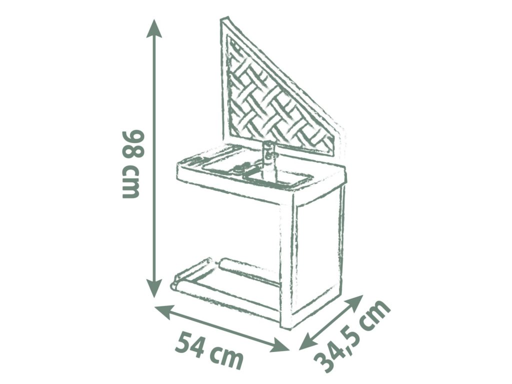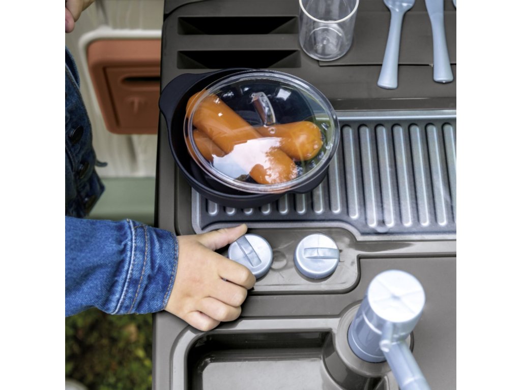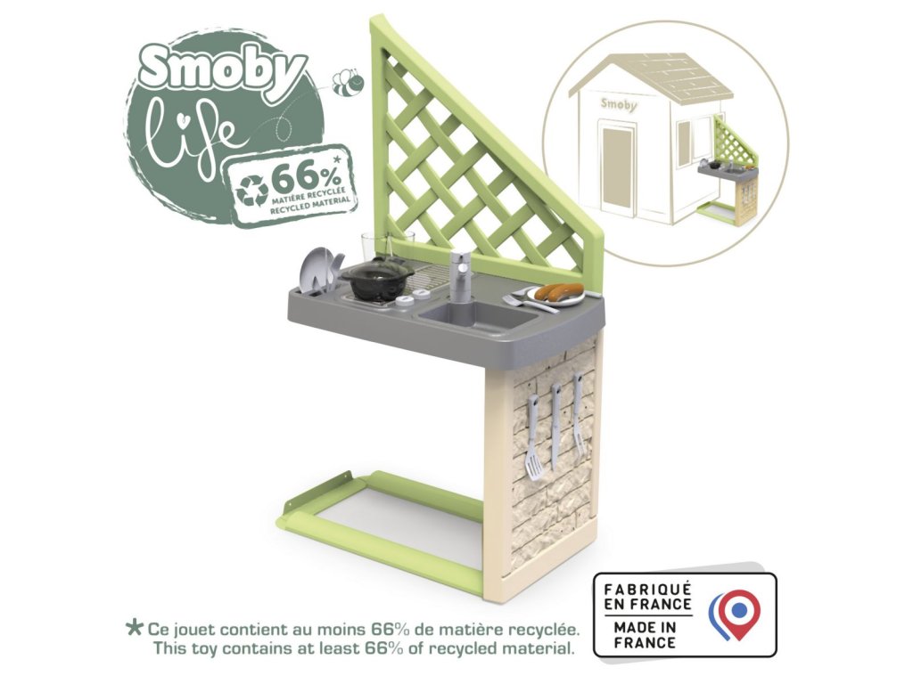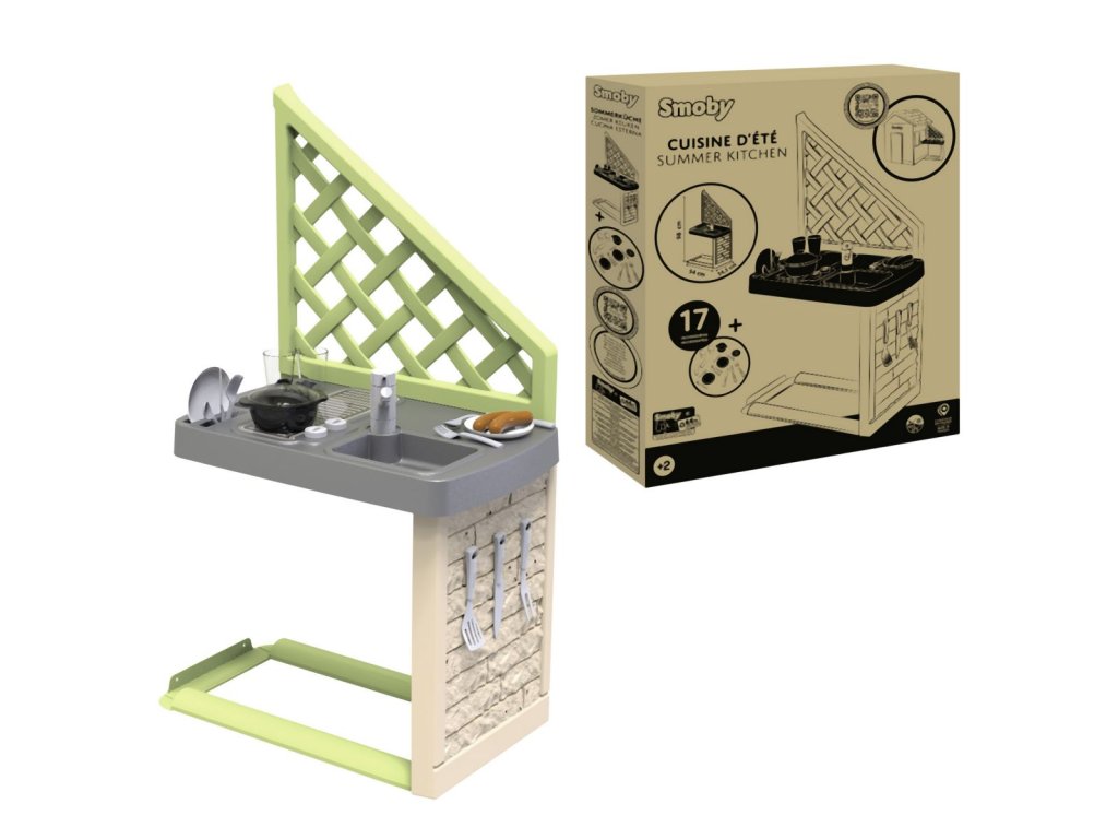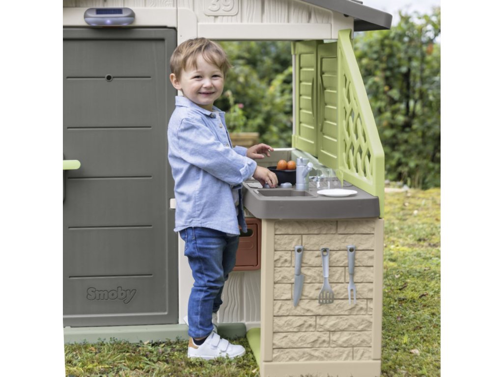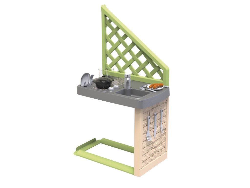 Letná kuchynka ako doplnok pre domček Neo Jura Lodge, Pretty, Nature, My Neo House, Neo Friends House, Chef, Boss House, My New House, Green Jura Lodge a Green Evo Friends House. Skladá sa z grilu a umývadla s kohútikom. Obsahuje 17 doplnkov - 2 poháre, 2 taniere, 2 klobásy, hrniec s pokrievkou a príbormi. Anti-UV ošetrenie zaručuje dobrú odolnosť a trvanlivosť farieb. Tento výrobok obsahuje minimálne 66 % recyklovaného materiálu. Rozmery produktu (DxŠxV): 54 x 34,5 x 98 cm.Dodatočné parametre