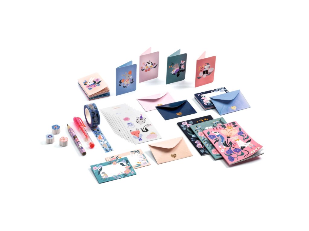 Listy s obálkami Korešpondenčná a písacia sada mini kariet s obálkami a mini zápisníkov na dôležité zápisky. Karty s obálkami sú mimoriadne vhodné na pozvánky alebo krátke blahoželania. Sada je poeticky ilustrovaná motívmi kvetov a personifikovaných zvieratiek. Ilustrácie sú ozvláštnené metalickým leskom. Obsahuje tiež mini gélové pero, ceruzku, gumy na gumovanie, ozdobnú lepiacu pásku a samolepky na obohatenie textov. Všetok obsah má miesto v škatuli s priehľadným okienkom vo veku.Papier a lepenka použité na výrobu majú ekologický certifikát FSC®.Obsah: 1 škatuľa s priehľadným okienkom vo veku, 3 mini zápisníky (10 čistých str.), 5 mini kariet (rozmery: 4 x 6 cm), 5 mini obálok, 4 hárky samolepiek (2 dizajny x 2 ks), 1 kotúč ozdobnej lepiacej pásky, 1 mini gélové pero, 1 mini ceruzka, 3 mini gumy na gumovanie.