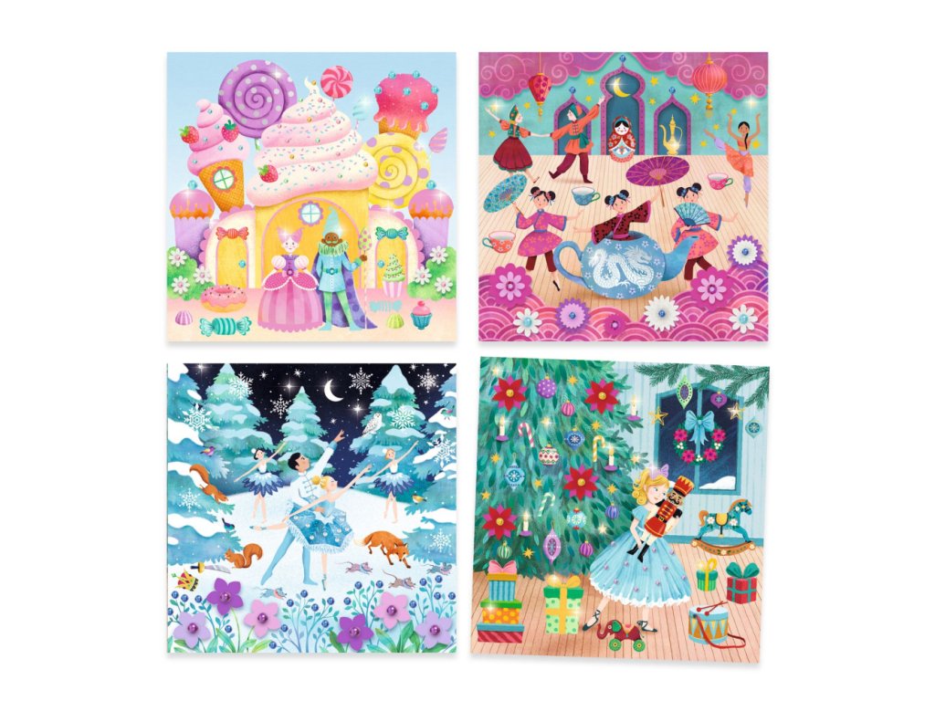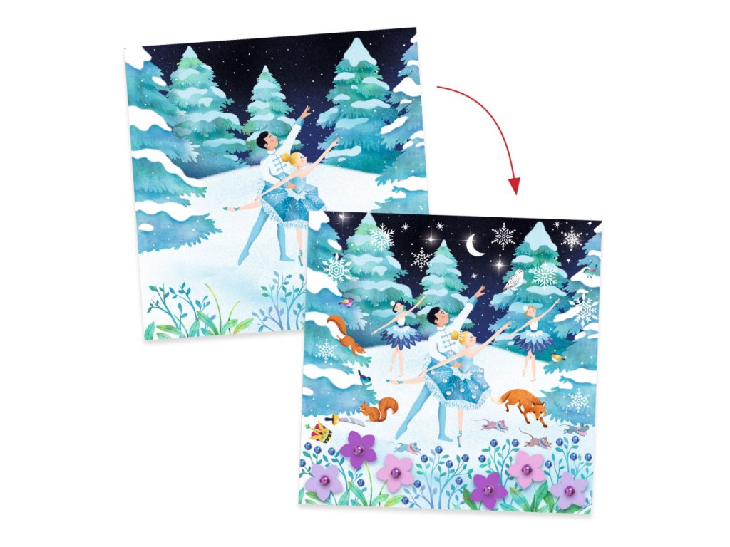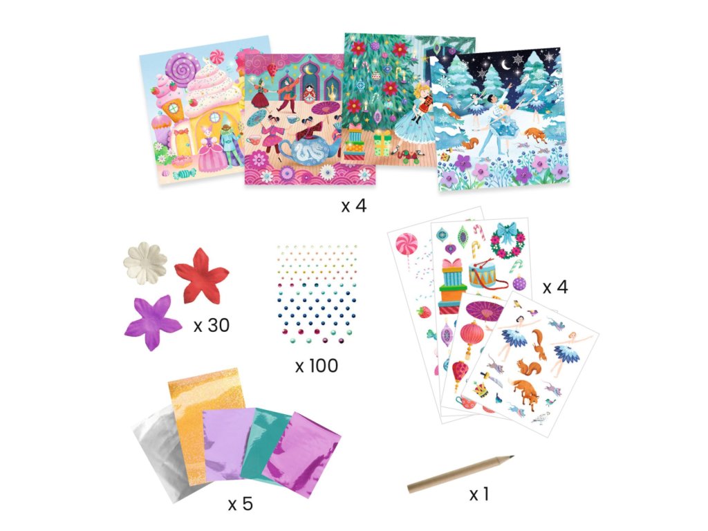 Luskáčik Príbehy z rozprávok na ozdobenieOživte klasický balet kreatívnou zábavou!S touto sadou Luskáčik – Príbehy z rozprávok sa deti prenesú do sveta známeho baletu a vytvoria vlastné umelecké diela. Štyri originálne ilustrácie kombinujú rôzne aktivity, ktoré podporujú kreativitu, jemnú motoriku a fantáziu.Prečo si deti zamilujú túto sadu?Štyri zábavné aktivity v jednej sade: obtláčacie fólie, papierové kvety, samolepiace kamienky a fóliové vzoryInšpirované slávnym baletom: štyri kľúčové scény – Štedrý večer, Valčík snehových vločiek, Tance sveta a Tanec cukrovej slivkovej vílyKreatívna kombinácia: každá ilustrácia spája všetky štyri aktivity a umožňuje detskú slobodu pri tvorbeEkologické balenie: kartón s certifikátom FSC® zodpovedá šetrnému prístupu k prírodeDodatočné parametre