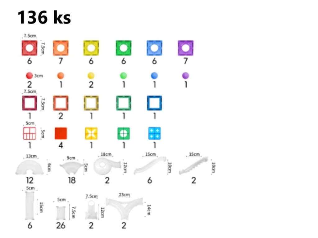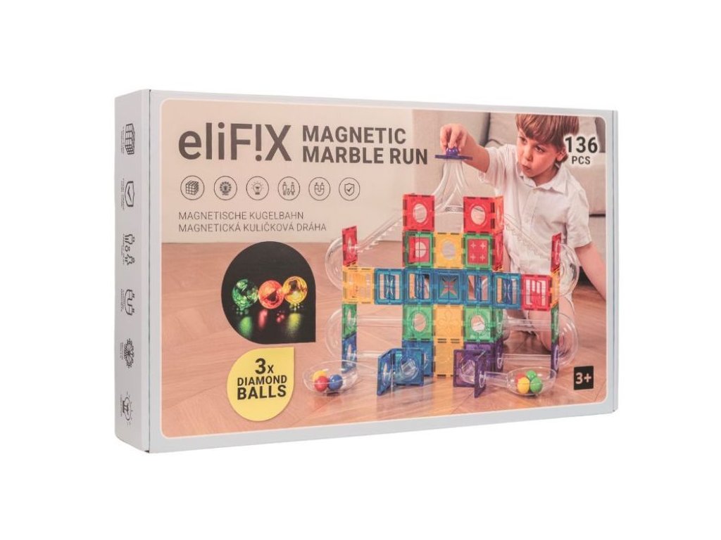 Magnetická guľôčková dráha s tunelmi Magnetická stavebnica Elifix ponúka množstvo dielikov na stavbu pokojných aj divokých dráh, po ktorých sviští osem farebných a tri svietiace diamantové guľôčky, tie sa pri pohybe rozsvietia a vo chvíli pokoja zhasnú. Deti si tak môžu naplno užiť čarovnú hru aj v tme, napríklad pred spaním. V stavebnici nájdete diely v tvare štvorcov a množstvo rôzne tvarovaných tunelov. Skladačka s tunelmi a dielmi v prekrásnych veselých farbách podporí hodiny neobmedzenej kreativity, zábavy a učenia prostredníctvom príjemného hrania. Postará sa o rozvoj jemnej a hrubej motoriky, zvýši schopnosť sústrediť sa, predstavivosť a trpezlivosť. Sledujte, ako deti vytvárajú cesty pre farebné guľôčky. Či už staviate samostatne alebo s priateľmi a rodinou bude to vždy skvele strávený čas. Magnety dobre držia stavbu pohromade, ale sú silné tak akurát, aby s nimi mohli manipulovať detské ručičky. Magnetická stavebnica môže doslova rásť s vašim dieťaťom. Jednotlivé stavebnice EliFix je možné vzájomne prepájať a vytvárať tak ešte väčšie a prepracovanejšie stavby. Kreatívna skladačka je vyrobená z netoxického ABS plastu, je teda úplne bezpečná na hranie aj učenie vašich detí. Stavebnice Elifix sú kompatibilné s ostatnými magnetickými stavebnicami z našej ponuky. Stavebnicu môžete doplniť ďalšou sadou 6 ks svietiacich diamantových guľôčok. Technické parametre: Obsah balenia: 136 ks, 3 svietiace guľôčky. Rozmer balenia: 53 x 32 x 8,6 cm. Rozmery dielikov: štvorec malý 7,5 x 7,5 cm, tunel rovný 5 x 15 cm (rozmery nájdete v galérii fotografií). Batérie v guľôčkach: CR2032 3V 210mAh (súčasť balenia). Materiál: ABS, magnet. Odporúčaný vek: od 3 rokov. Upozornenie: Videá sú ilustračné, môžu sa v nich vyskytovať diely z iných setov stavebnice Elifix. Značka eliNeli prináša do detského sveta moderný dizajn v spojení s moderným európskym štýlom inšpirovaným nemeckou kvalitou a dizajnom. Prioritou pri výrobe sú prírodné materiály, prírodné drevo, čím podporuje udržateľnosť a bezpečnosť hračiek. Produkty eliNeli sú navrhnuté s ohľadom na reálne potreby detí a rešpektujú ich rozvojové fáze podľa montessori metodiky. S eliNeli sa deti učia, tvoria a rastú v bezpečnom a podnetnom prostredí, ktoré nielen spĺňa, ale prekonáva ich očakávania. Viac o produktoch eliNeli nájdete na: https://www.elineli.eu/sk/. Pozrite si variabilitu magnetickej guľôčkovej dráhy: