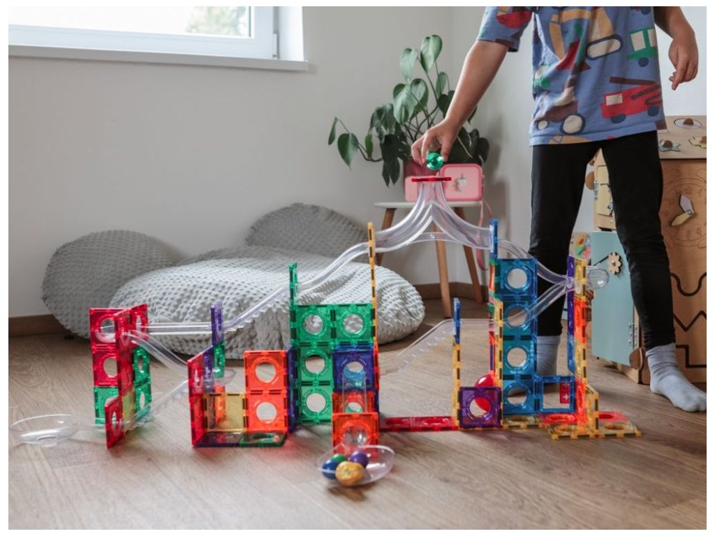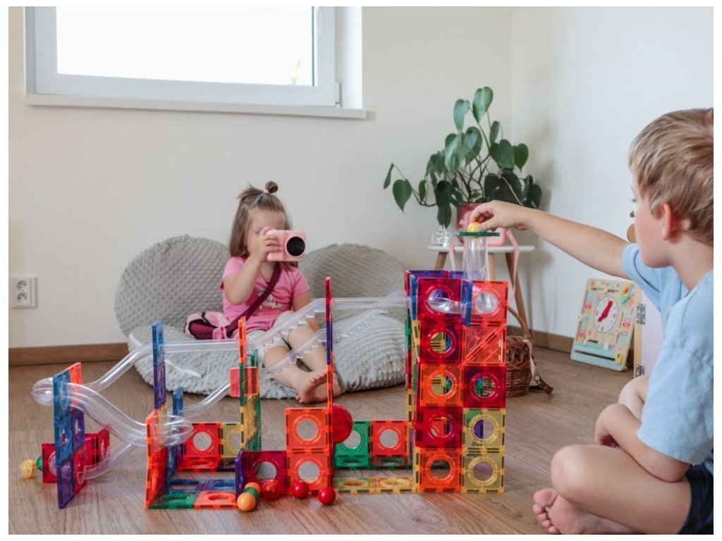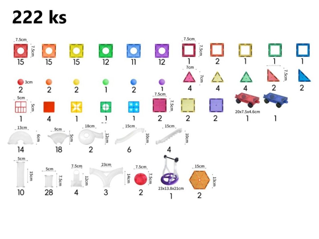 Veľká sada magnetických dielov na stavbu guľôčkovej dráhy Magnetická stavebnica Elifix ponúka množstvo dielikov na stavbu pokojných aj divokých dráh, po ktorých sviští desať farebných a tri svietiace diamantové guľôčky, tie sa pri pohybe rozsvietia a vo chvíli pokoja zhasnú. Deti si tak môžu naplno užiť čarovnú hru aj v tme, napríklad pred spaním. V stavebnici nájdete diely v tvare trojuholníkov, štvorcov, množstvo rôzne tvarovaných tunelov a dva podvozky na kolesách na stavbu vozidiel. Skladačka s tunelmi a dielmi v prekrásnych veselých farbách podporia hodiny neobmedzenej kreativity, zábavy a učenia prostredníctvom príjemného hrania. Postará sa o rozvoj jemnej a hrubej motoriky, zvýši schopnosť sústrediť sa, predstavivosť a trpezlivosť. Sledujte, ako deti vytvárajú cesty pre farebné guľôčky. Či už staviate samostatne alebo s priateľmi a rodinou bude to vždy skvele strávený čas. Magnety dobre držia stavbu pohromade, ale sú silné tak akurát, aby s nimi mohli manipulovať detské ručičky. Magnetická stavebnica môže doslova rásť s vašim dieťaťom. Jednotlivé stavebnice EliFix je možné vzájomne prepájať a vytvárať tak ešte väčšie a prepracovanejšie stavby. Kreatívna skladačka je vyrobená z netoxického ABS plastu, je teda úplne bezpečná na hranie aj učenie vašich detí. Stavebnice Elifix sú kompatibilné s ostatnými magnetickými stavebnicami z našej ponuky. Stavebnicu môžete doplniť ďalšou sadou 6 ks svietiacich diamantových guľôčok. Technické parametre: Obsah balenie: 222 ks, 3 svietiace guľôčky. Rozmer balenia: 48,5 x 40 x 10,6 cm. Rozmery dielikov: štvorec malý 7,5 x 7,5 cm, trojuholník rovnostranný 7 x 7 cm, trojuholník pravouhlý 7,5 x 7,5 cm, podvozok 4,6 x 20 x 7,5 cm (rozmery nájdete v galérii fotografií). Batérie v guľôčkach: CR2032 3V 210mAh (súčasť balenia). Materiál: ABS, magnet. Odporúčaný vek: od 3 rokov. Upozornenie: Videá sú ilustračné, môžu sa v nich vyskytovať diely z iných setov stavebnice Elifix. Značka eliNeli prináša do detského sveta moderný dizajn v spojení s moderným európskym štýlom inšpirovaným nemeckou kvalitou a dizajnom. Prioritou pri výrobe sú prírodné materiály, prírodné drevo, čím podporuje udržateľnosť a bezpečnosť hračiek. Produkty eliNeli sú navrhnuté s ohľadom na reálne potreby detí a rešpektujú ich rozvojové fáze podľa montessori metodiky. S eliNeli sa deti učia, tvoria a rastú v bezpečnom a podnetnom prostredí, ktoré nielen spĺňa, ale prekonáva ich očakávania. Viac o produktoch eliNeli nájdete na: https://www.elineli.eu/sk/. Pozrite si variabilitu magnetickej guľôčkovej dráhy: