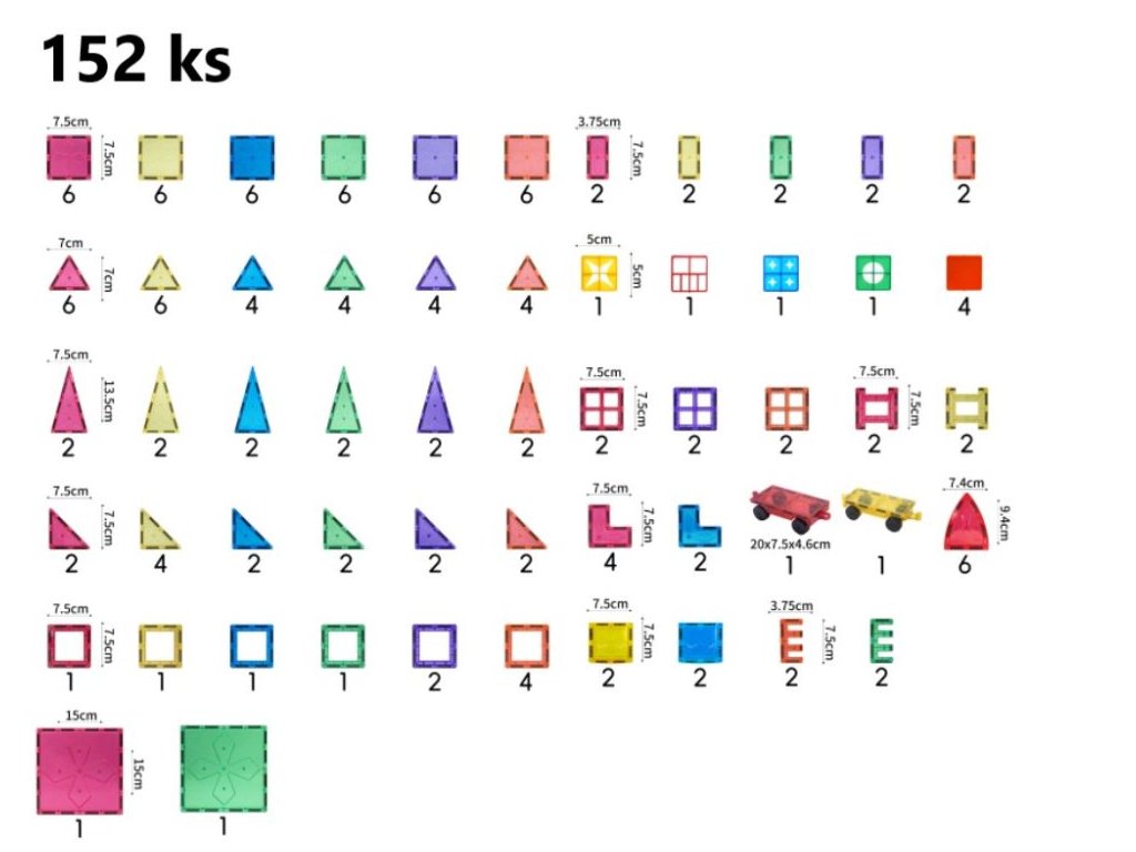 Skladačka s magnetmi pre tvorivé deti Kreatívna magnetická stavebnica Elifix 152 ks vo veselých farbách, s dizajnom listov, je navrhnutá tak, aby podporovala hodiny neobmedzenej kreativity, zábavy a učenia prostredníctvom príjemného hrania. Postará sa o rozvoj jemnej a hrubej motoriky, zvýši schopnosť sústrediť sa, predstavivosť a trpezlivosť. Navyše podporuje priestorové vnímanie, logiku a napomáha pochopeniu fyzikálnych zákonitostí. Magnetická sada ponúka množstvo štvorcov, obdĺžnikov, trojuholníkov, plotov, okien a tiež dva podvozky na kolesách na originálne výtvory nielen vašich detí. Čo tak si dnes postaviť hrad? Alebo to bude dinosaurus, raketa, nákladiak, zoo alebo napríklad dráha pre guľôčky? S magnetickou stavebnicou EliFix nie je nič nemožné! Môžete stavať, prepájať, vytvárať dúhové obrazce alebo zapojiť ďalšie hračky a nábytok ako súčasť stavby. Sledujte, ako deti vytvárajú úžasné stavby a veľdiela a pripojte sa k nim. S touto stavebnicou sa vždy môžete hrať iným spôsobom. Rozhodne to pre vás bude skvele strávený spoločný čas. Magnety dobre držia stavbu pohromade, ale sú silné tak akurát, aby s nimi mohli manipulovať detské ručičky. Magnetická stavebnica môže doslova rásť s vašim dieťaťom. Jednotlivé stavebnice EliFix je možné vzájomne prepájať a vytvárať tak ešte väčšie a prepracovanejšie stavby. Kreatívna skladačka je vyrobená z netoxického ABS plastu, je teda úplne bezpečná na hranie aj učenie vašich detí. Stavebnice Elifix sú kompatibilné s ostatnými magnetickými stavebnicami z našej ponuky. Technické parametre: Obsah balenia: 152 ks. Rozmery dielikov: štvorec malý 7,5 x 7,5 cm, štvorec veľký 15 x 15 cm, trojuholník rovnostranný 7 x 7 cm, trojuholník pravouhlý 7,5 x 7,5 cm, trojuholník vysoký 13,5 x 7,5 cm, podvozok 4,6 x 20 x 7,5 cm (rozmery nájdete v galérii fotografií). Rozmer balenia: 41,8 x 24,5 x 8,9 cm. Materiál: ABS, magnet. Odporúčaný vek: od 3 rokov. Upozornenie: Videá sú ilustračné, môžu sa v nich vyskytovať diely z iných setov stavebnice Elifix. Značka eliNeli prináša do detského sveta moderný dizajn v spojení s moderným európskym štýlom inšpirovaným nemeckou kvalitou a dizajnom. Prioritou pri výrobe sú prírodné materiály, prírodné drevo, čím podporuje udržateľnosť a bezpečnosť hračiek. Produkty eliNeli sú navrhnuté s ohľadom na reálne potreby detí a rešpektujú ich rozvojové fáze podľa montessori metodiky. S eliNeli sa deti učia, tvoria a rastú v bezpečnom a podnetnom prostredí, ktoré nielen spĺňa, ale prekonáva ich očakávania. Viac o produktoch eliNeli nájdete na: https://www.elineli.eu/sk/. Pozrite sa na neobmedzené možnosti stavania s kreatívnou stavebnicou Elifix:Dodatočné parametre