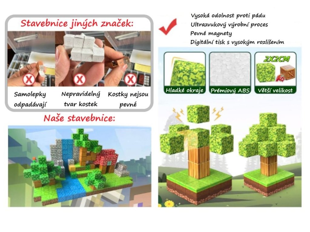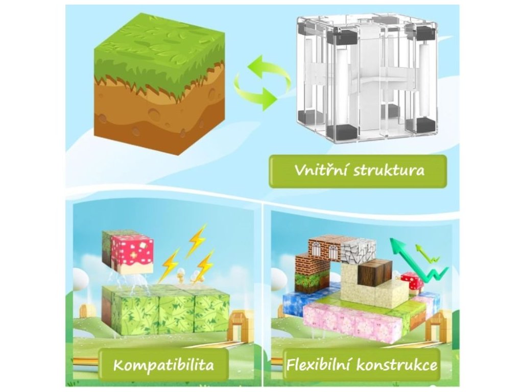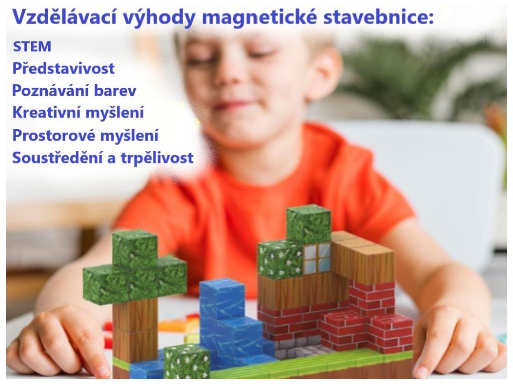 Magnetická stavebnica na nekonečné stavanie Rozšírte svet fantázie a tvorenie so sadou magnetických kociek v dizajne obľúbenej virtuálnej hry, ktorá prináša množstvo možností, nápadov a zábavy. Vďaka pevným magnetom a premyslenej konštrukcii môžu deti stavať nielen jednoduché tvary, ale aj zložité budovy, dedinky alebo originálne stavby podľa vlastnej fantázie. Každý dielik s digitálnou potlačou vo vysokom rozlíšení je vyrobený z prémiového ABS plastu a uzavretý pomocou ultrazvukového výrobného procesu, ktorý zaručuje, že magnety zostanú bezpečne vo vnútri. Dieliky v ideálnej veľkosti s hladkými hranami sú príjemné na dotyk a odolné. Vďaka flexibilnej konštrukcii a vnútornej štruktúre je stavanie jednoduché a intuitívne. Stačí len pár kúskov a vyrastie pred vami dom, hrad alebo dedinka. Magnetické stavebnice podporujú kreativitu, logické myslenie, priestorovú predstavivosť, jemnú motoriku, STEM schopnosti (veda, technológie, inžinierstvo, matematika), a spájajú zábavu s učením. Je to hračka, ktorá prináša radosť celej rodine. Technické parametre: Obsah balenia: 128 ks. Rozmery balenia: 36 x 24 x 3,5 cm. Materiál: PP, magnet. Odporúčaný vek: od 3 rokov, 3+. Certifikáty a normy: EN71, CE, UKCA, ASTM, CPC, 10P, CPSIA.