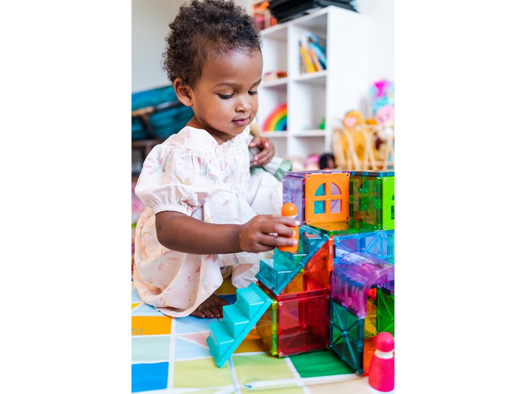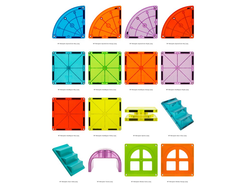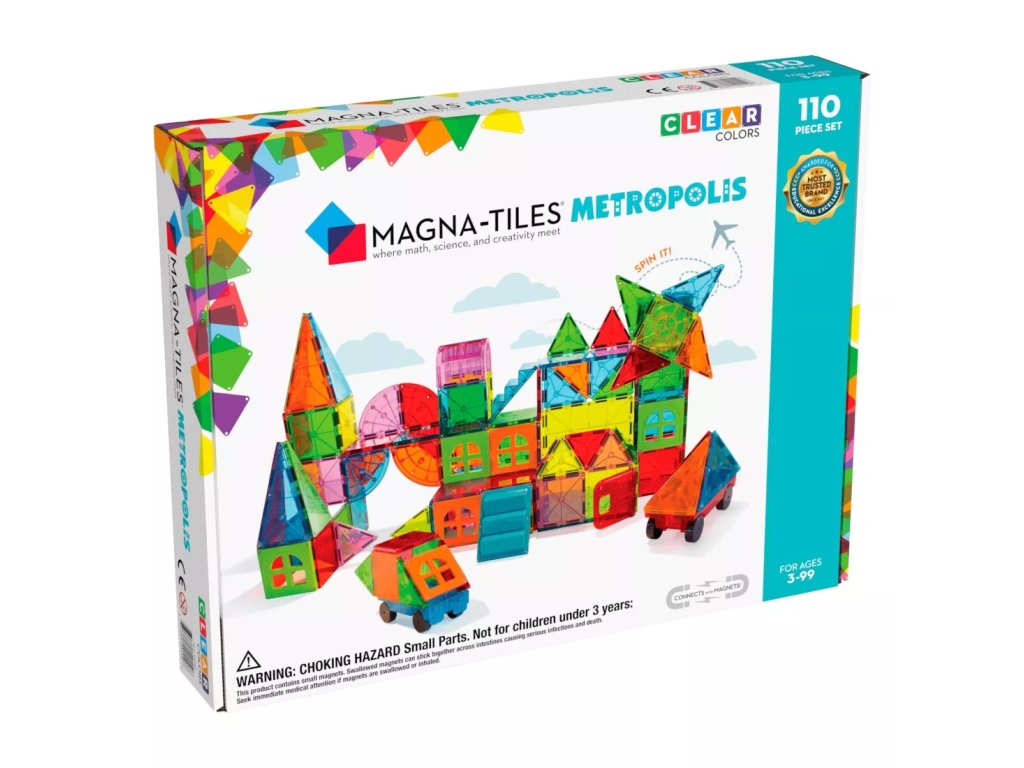 Magnetická stavebnica Metropolis 110 dielov Vytvorte úžasné stavby s najväčšou magnetickou stavebnicou Metropolis je zatiaľ najväčšou magnetickou stavebnicou MAGNA-TILES, s ktorou si deti môžu postaviť čokoľvek – od mestských panorám cez stredoveké pevnosti až po vesmírne stavby. Sada obsahuje 110 magnetických dielikov rôznych geometrických a jedinečných tvarov, ako sú okná, dvere či schodiská. Stavebnica v neónových farbách prináša deťom hodiny nápaditej a sústredenej zábavy. Je kompatibilná so všetkými súpravami Magna-Tile®, čo umožňuje nekonečné možnosti kombinácií.Zmysluplná stavebnica pre malých staviteľov MAGNA-TILES je zástancom zmysluplnej hry, to znamená zábavnej a pútavej, no zároveň založenej na rozvíjaní detských zručností. Táto stavebnica podporuje rozvoj koordinácie ruka-oko, jemnej motoriky a logického myslenia prostredníctvom skúmania príčin a následkov. Bezpečnosť a špičková kvalita sú zaistené použitím potravinárskeho, netoxického plastu MABS bez BPA, ftalátov a latexu. Pevná konštrukcia dielikov praskanie a udržiavanie magnety bezpečne na svojom mieste.Sada obsahuje 110 magnetických dielikov:56x štvorec,2x veľký štvorec,12x rovnostranný trojuholník,12x pravý trojuholník,10x rovnoramenný trojuholník,2x kolesový podvozok,1x veľký obdĺžnik,2x schodisko,4x štvrťkruh,1x spinner,6x okno,1x dvere,1x oblúk.Dodatočné parametre