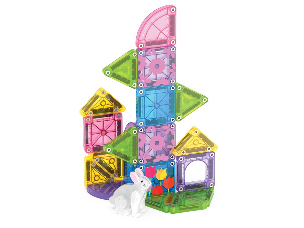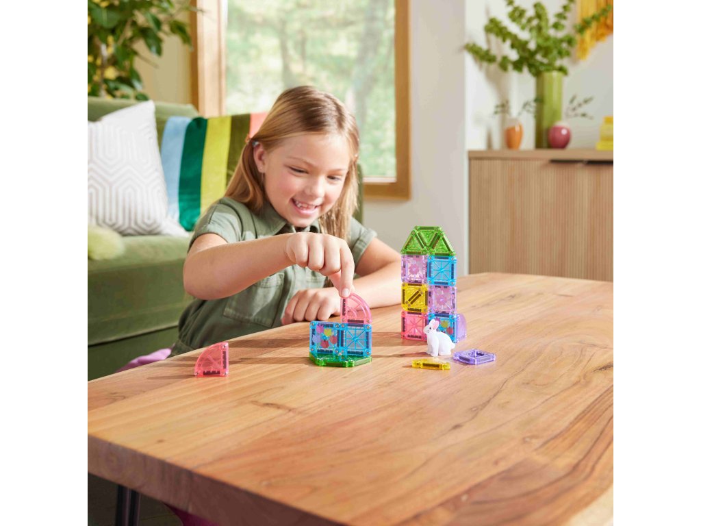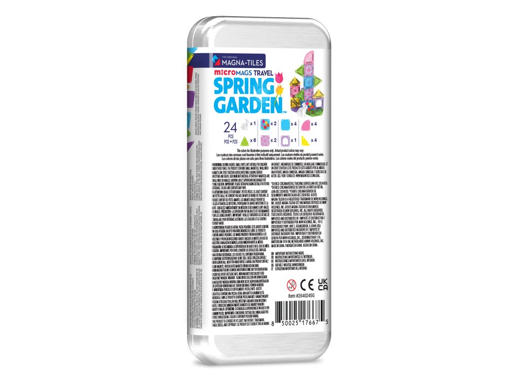 Magnetická stavebnica microMAGS Spring Garden Travel Set 24 dielov Rozkvitnite kreativitu – kdekoľvek na cestách Cestovná magnetická stavebnica MAGNA-TILES microMAGS Spring Garden Travel Set prináša radosť, kreativitu a zábavu v kompaktnom balení. Ozdobené kvetinové dieliky, pastelové štvrťkruhové tvary a roztomilá figurka zajka inšpirujú deti k vytváraniu jasných, hravých jarných svetov, či už doma, na výlete alebo na cestách. Čím je tento set výnimočný? 24 microMAGS dielikov umožňuje stavať farebné a detailné jarné scény. Ozdobené kvetinové dieliky a pastelové štvrťkruhy dodávajú stavbám pohyb, rozmanitosť a hravý charakter. Exkluzívna figúrka zajka prináša do hry príbehový prvok a zábavu pre malých staviteľov. Kompaktné balenie je ideálne na cestovanie, dovolenky, reštaurácie alebo cestu autom. Všetky dieliky sú plne kompatibilné so všetkými stavebnicami MAGNA-TILES, takže sa ľahko kombinujú s ďalšími sadami. Zmysluplná hra pre rozvoj detí Stavebnica podporuje jemnú motoriku, koordináciu ruka–oko, priestorové vnímanie a kreativitu. Deti sa učia tvoriť príbehy a rozvíjať fantáziu bez návodu, slobodne a vlastným tempom.Vyrobená z potravinárskeho, netoxického plastu MABS, bez BPA, ftalátov a latexu. Pevná konštrukcia, odolná mriežka a bezpečne upevnené magnety zaručujú dlhú životnosť a bezpečné hranie pre deti od 3 rokov. Sada obsahuje 24 magnetických dielikov microMAGS: 1 figurka zajka 6 rovnostranných trojuholníkov (trávovo zelená) 2 štvorce (tyrkysová) 2 štvorce (ružová) 2 ozdobené štvorce (fialové kvety) 2 ozdobené štvorce (tyrkysové tulipány) 1 oblúkové okno (svetlo fialová) 4 pravouhlé trojuholníky (žltá) 2 štvrťkruhy (svetlo fialová) 2 štvrťkruhy (ružová)