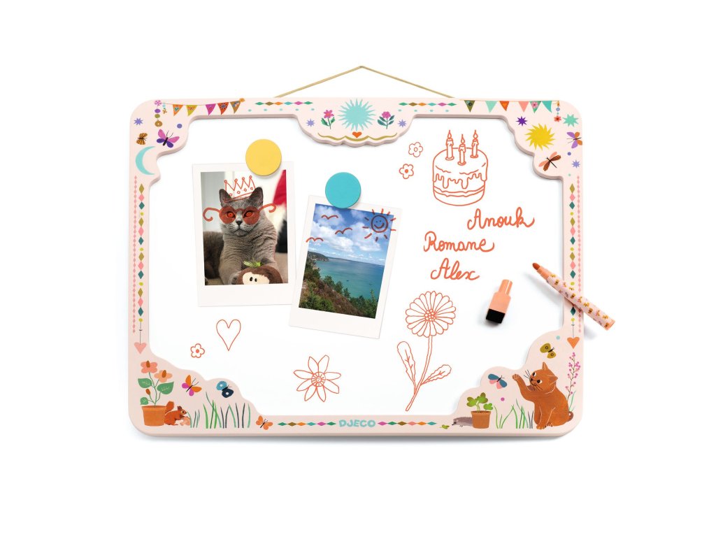 Magnetická tabuľka s fixkou Mačka Odkazy, kresby aj fotky na jednom mieste: magnetická tabuľka s mačičkou do detskej izbyMagnetická tabuľka Mačka je šikovná nástenka aj kresliaca plocha v jednom.Má kovový magnetický povrch v pevnom drevenom ráme a vďaka šnúrke na zavesenie si nájde miesto na stene v detskej izbe, v predsieni aj v kuchyni.Deti na ňu môžu písať a kresliť stierateľnou fixkou, rodičia zas rýchlo pripnú odkaz, rozvrh či obrázok pomocou magnetiek.Rýchly prehľad odporúčaný vek: od 5 rokov použitie: písanie, kreslenie, magnetická nástenka na odkazy a obrázky rozvíja: kreativitu, grafomotoriku, plánovanie a samostatnosť v balení: magnetická tabuľka, stierateľná fixka s magnetickou gumouPrečo si ju deti zamilujú môžu si vytvoriť „vlastný kútik“ na odkazy, kresby a nápady bez neporiadku – kreslí sa fixkou a ľahko sa zotrie mačičkový motív pôsobí milo – tabuľka je aj dekorácia pevné spracovanie a príjemné materiály na každodenné používanieTechnické parametre materiál: drevo, kov, plast (fixka) rozmery produktu: 46 × 38 × 1 cm rozmery balenia: 47 × 40,2 × 3 cm údržba: povrch čistite jemne vlhkou handričkouDodatočné parametre