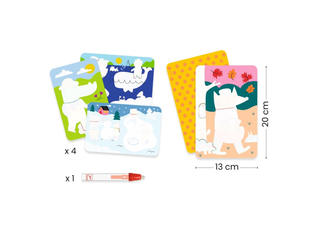 Maľovanie vodou 4 ročné obdobiaKúzlo farieb počas celého rokaSada Maľovanie vodou 4 ročné obdobia je skvelá kreatívna aktivita pre deti od 18 mesiacov. Pomocou špeciálneho štetca-ceruzky naplnenej vodou môžu deti „oživiť“ biele plochy na obrázkoch a objaviť nádherné farby a vzory. Po zaschnutí sa plochy opäť zbielia, takže sa dá obrázok vyfarbovať znova a znova.Prečo je táto sada ideálna pre deti: Rozvíja jemnú motoriku a koordináciu ruky a oka Podporuje kreativitu a predstavivosť Opakovane použiteľná – farby sa objavia len pri kontakte s vodou Bezpečné a jednoduché použitie bez špiny Obsah balenia: 4 obrázky s motívmi štyroch ročných období Štetec s pevnou plstenou špičkou a nádržkou na vodu Táto sada je ideálna na dlhé hodiny zábavy, tvorenia a objavovania farieb bez neporiadku.Dodatočné parametre