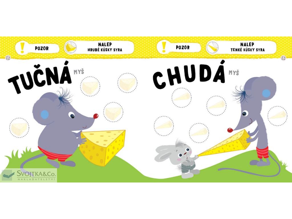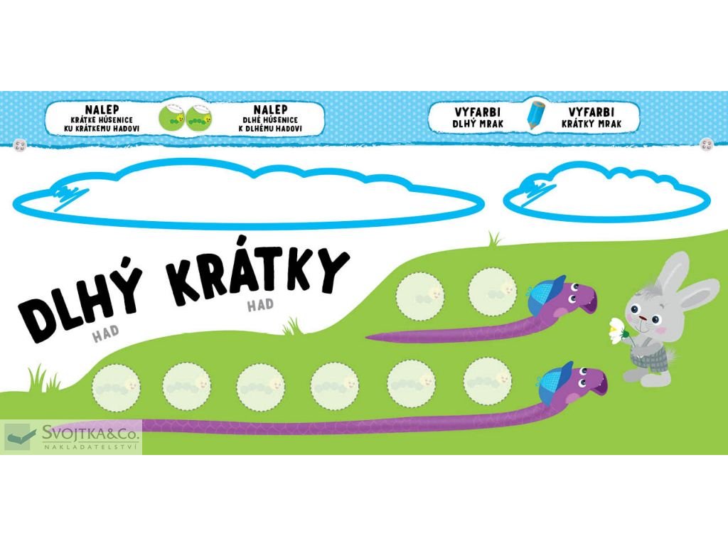 Malý zajačik a protiklady V tejto knižke nájdu naši najmenší malého zajačika a plno jednoduchých aktivít. Nauč sa protiklady s malým zajačikom! Spoznáš, kto je malý a kto veľký? Ktorý had je krátky a ktorá húsenica je dlhá? Myšky hľadajú hrubé kúsky syra, pomôž im! Všetko musíš ešte správne vyfarbiť, spojiť a nalepiť samolepky na tie správne miesta. V tejto knižke sa deti zoznámia s protikladmi vďaka jednoduchým aktivitám nielen so samolepkami. Tak rýchlo, pusť sa spoločne s malým zajačikom do učenia!Dodatočné parametre