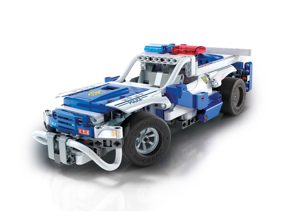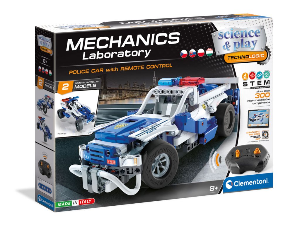 Úžasná vedecká súprava na objavovanie princípov mechaniky a strojárstva a na prevádzku na plnú rýchlosť s dvoma modelmi policajných áut. Obsahuje viac ako 300 komponentov na zostavenie, dva elektromotory na pohon zadných kolies a predného volantu, prevody a prevodovú jednotku. Možno tak zostaviť 2 verzie policajných áut na diaľkové ovládanie. Baterie 3 x 1,5V AAA/LR3 (diaľkový ovládač) a 4x 1,5V AA/LR6 (prijímač) nie sú súčasťou balenia. Pripojením automobilov k vysokofrekvenčnému prijímaču môžu deti ovládať automobily pomocou diaľkového ovládania a začať dychberúce automobilové preteky. Ilustrovaná príručka a bezplatná špeciálna aplikácia budú sprevádzať deti krok za krokom pri vytváraní modelov. Rozmer balenia: 45,1 x 47 x 7 cm. Vek: 8+Dodatočné parametre