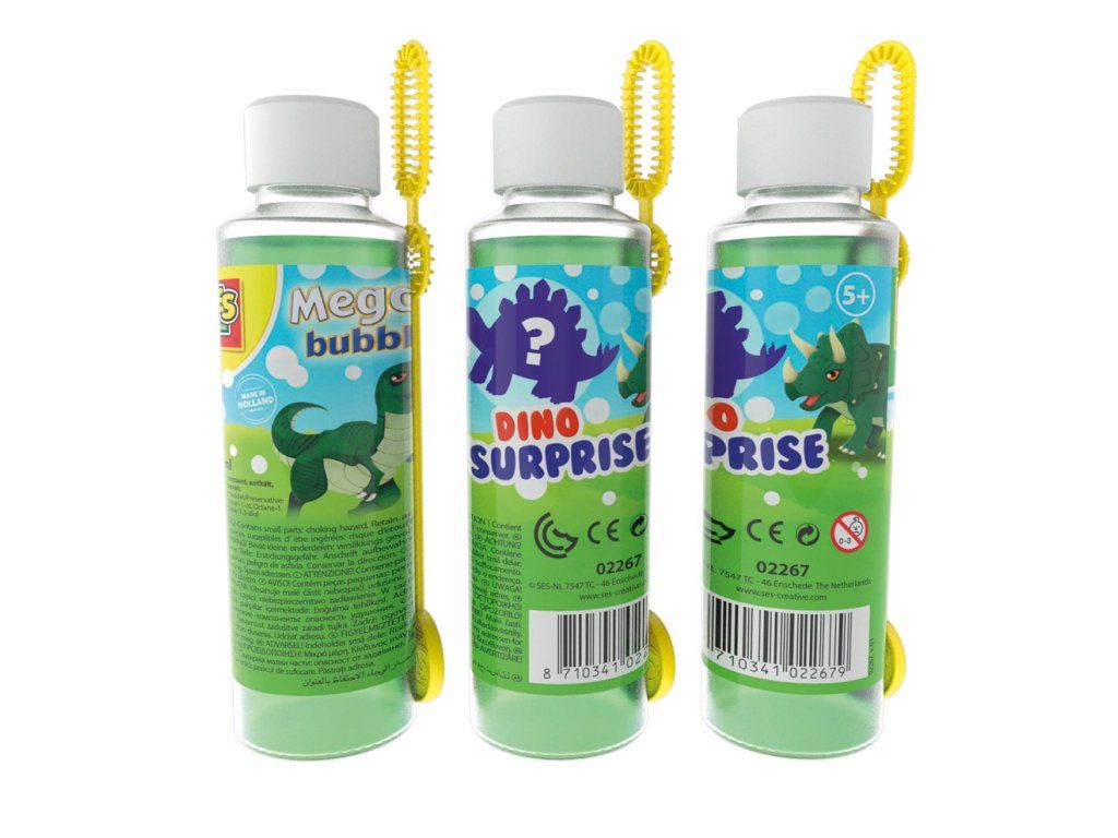 Uspořádejte velkou bublinkovou party s Mega bublifukem Dino s překvapením od SES. Na dně lahvičky (200ml) se skrývá cool dinosaurus. Vytvoř super velké bubliny a odhal svého dinosaura. Sada obsahuje: 1x 200 ml super silný roztok bublifuku, 1 dinosaurus. Rozměr balení: 4,5 x 5 x 16 cm. Věk: 5+Dodatočné parametre