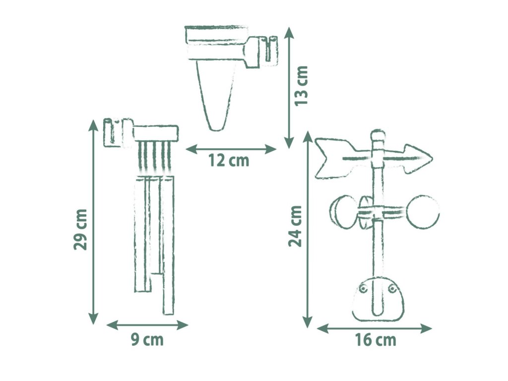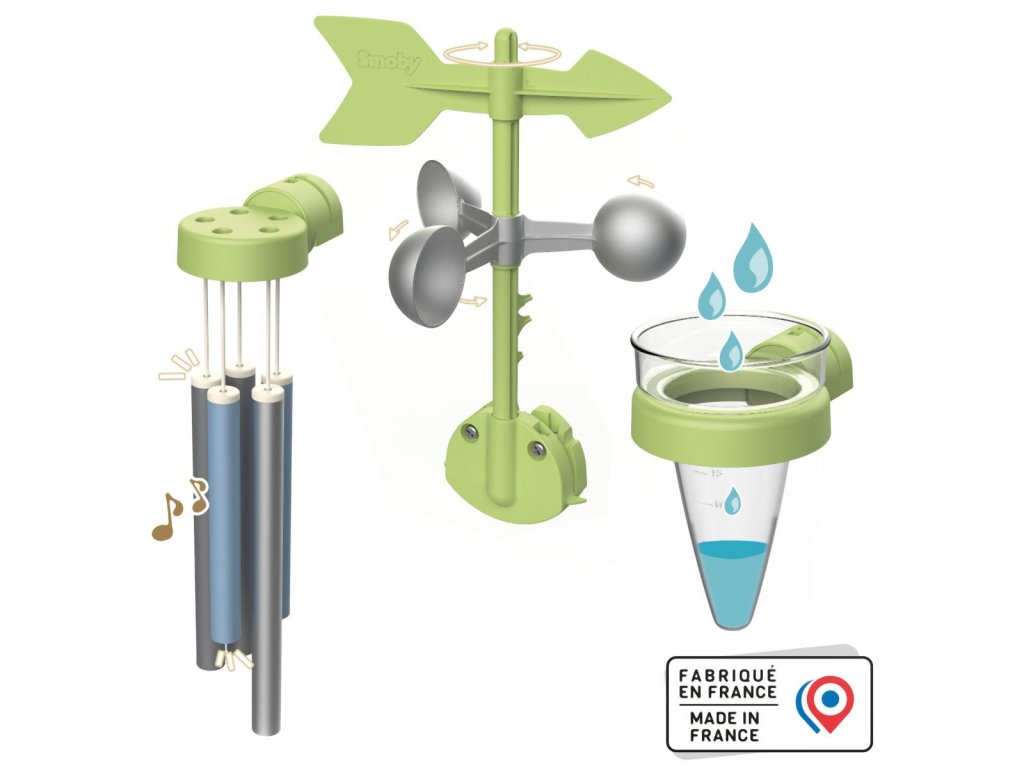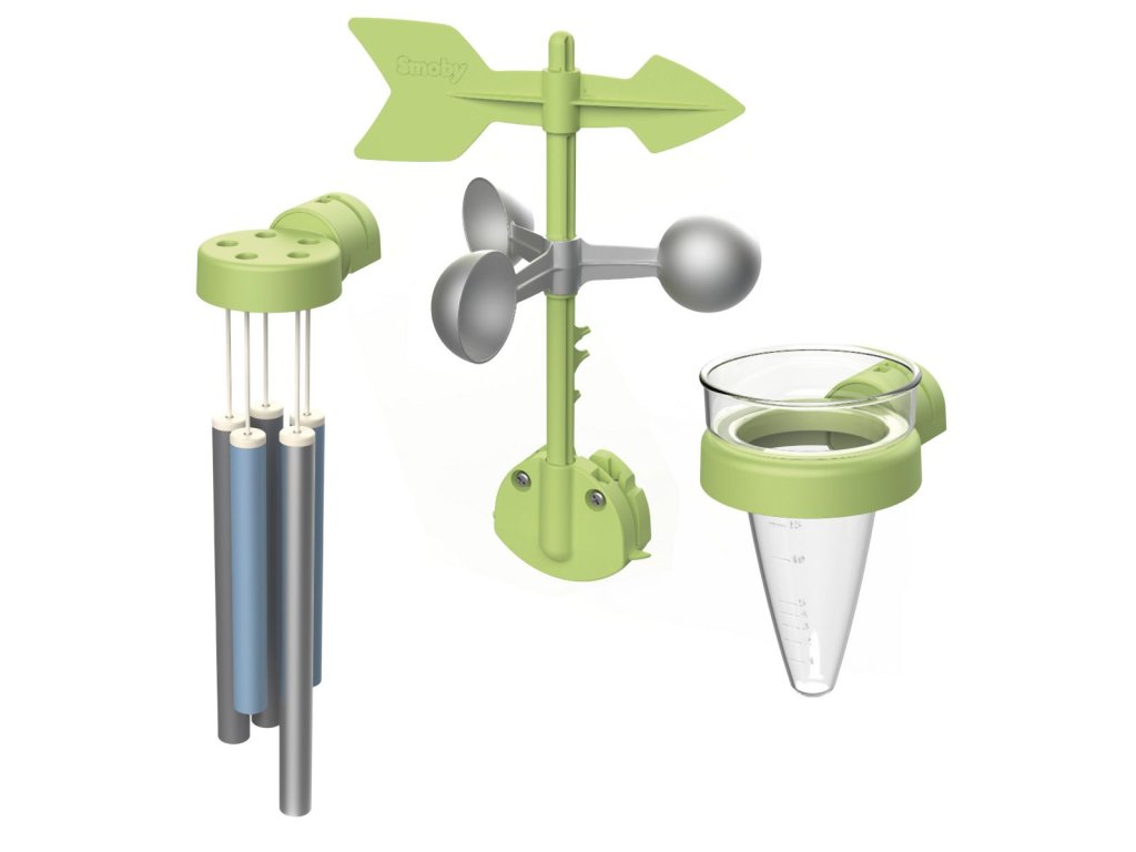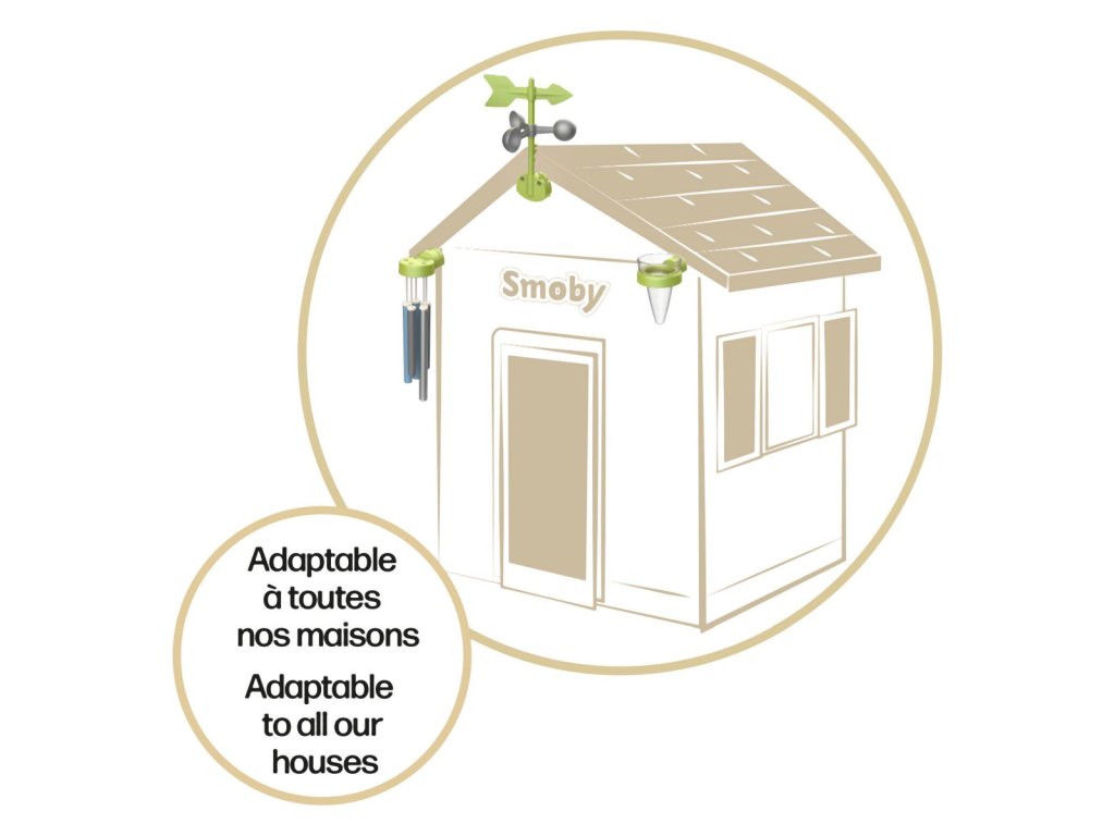 Hracia sada meteorologická stanica na skúmanie počasia: zvonkohra, veterná korouhvička/anemometer a zrážkomer. Sada je kompatibilná so všetkými domčekmi Smoby. S touto sadou môžu deti objavovať a pozorovať javy počasia. Možno ľahko pripevniť. Súprava je vyrobená z vysoko kvalitného plastu odolnému voči UV žiareniu a je obzvlášť odolná voči poveternostným vplyvom a vyblednutiu.Dodatočné parametre
