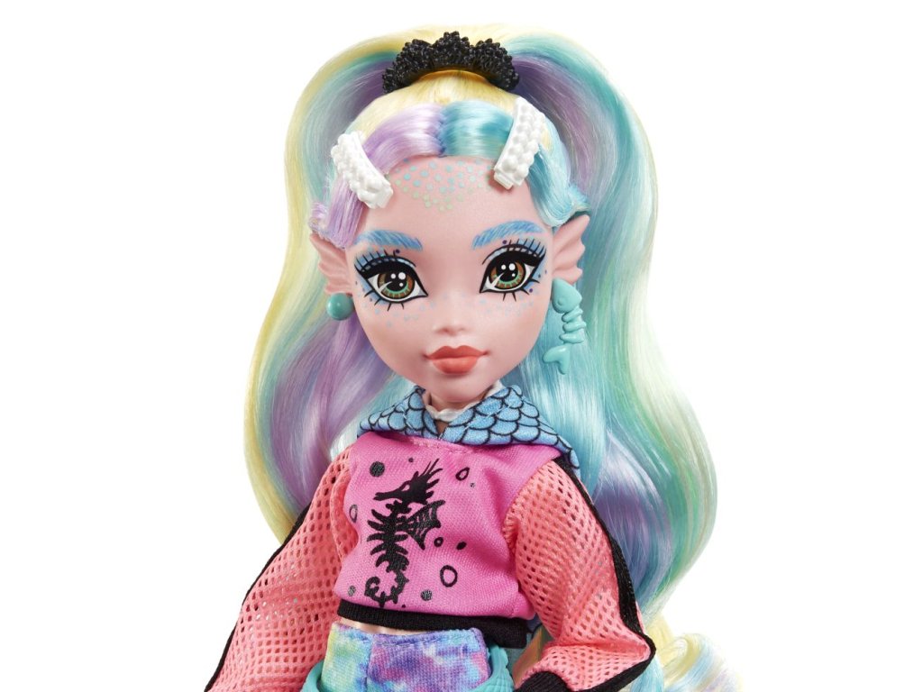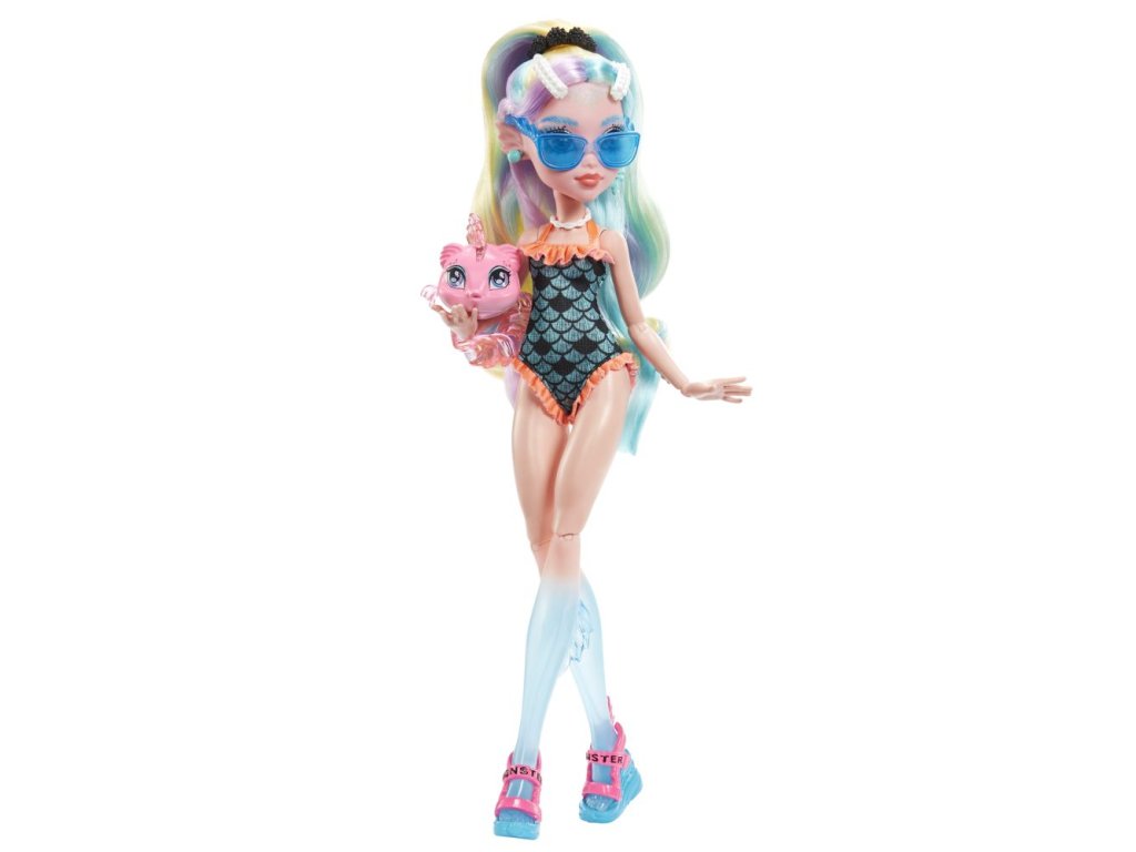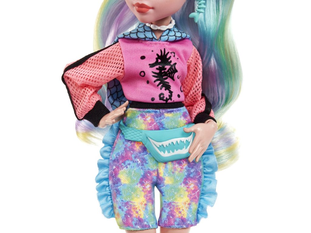 Škola je opäť v plnom prúde a ľahko prízrační študenti z Monster High™ dokážu dať školskej uniforme pekne na frak! Lagoona Blue™ doslova prepláva školskými chodbami v outfite, ktorý sa vezie na poslednej módnej vlne. Sieťované rukávy na pastelovo ružovom tope sú inšpirované rybárskou sieťou a batikovaný dúhový overal s krátkymi nohavicami vyzerá ako z morských koralov. Trendy ľadvinka, sandále na vysokej platforme a batoh posiaty lastúrami potvrdzujú jej dokonalý vkus. "Metalické" plavky s detailmi v podobe rybích šupín a jej roztomilý maznáčik, rybička Neptún™, urobia z Lagoony Blue™ dokonalú hviezdu. Bábika nemôže stáť samostatne. Farby a prevedenia sa môžu líšiť.Dodatočné parametre