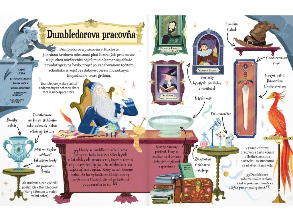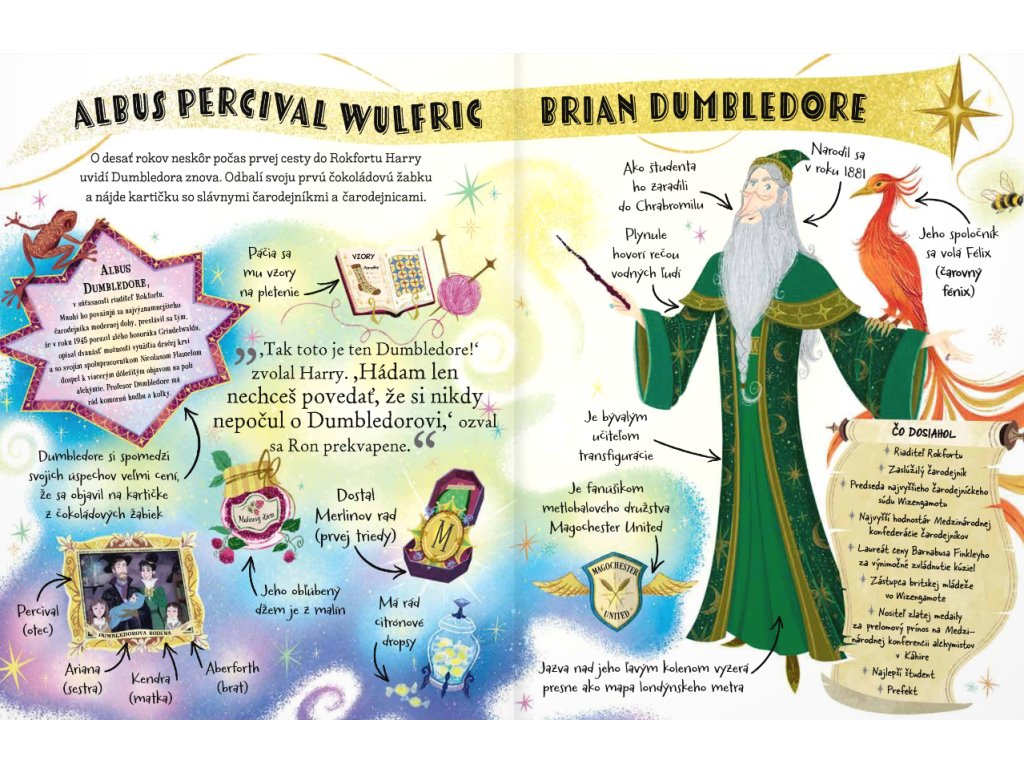 Mini potterovky Profesor Dumbledore Vstúp do magického sveta a spoznaj riaditeľa Rokfortu: múdrosť, tajomstvá a zábavné fakty o DumbledoroviPrečo je profesor Dumbledore taký obľúbený riaditeľ? Čo sa o ňom píše na kartičke z čokoládových žabiek? Ktorý metlobalový tím má najradšej? Nová zberateľská séria ilustrovaných knižiek, ktoré začínajúcim čitateľom predstavia svet mágie a obľúbené postavy z populárnej série o Harrym Potterovi. Všetky dôležité informácie sú podané s humorom a fantáziou, pričom život im vdýchli svetovo uznávaní ilustrátori. Séria knižiek s názvom Mini potterovky bola navrhnutá tak, aby priviedla k čítaniu novú generáciu mladých čitateľov a zoznámila ich s jedinečným svetom čarodejníkov. Verných fanúšikov populárneho čarodejníka s jazvou v tvare blesku na čele zas poteší a rozšíri ich knižnú zbierku.Dodatočné parametre