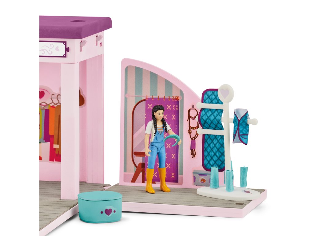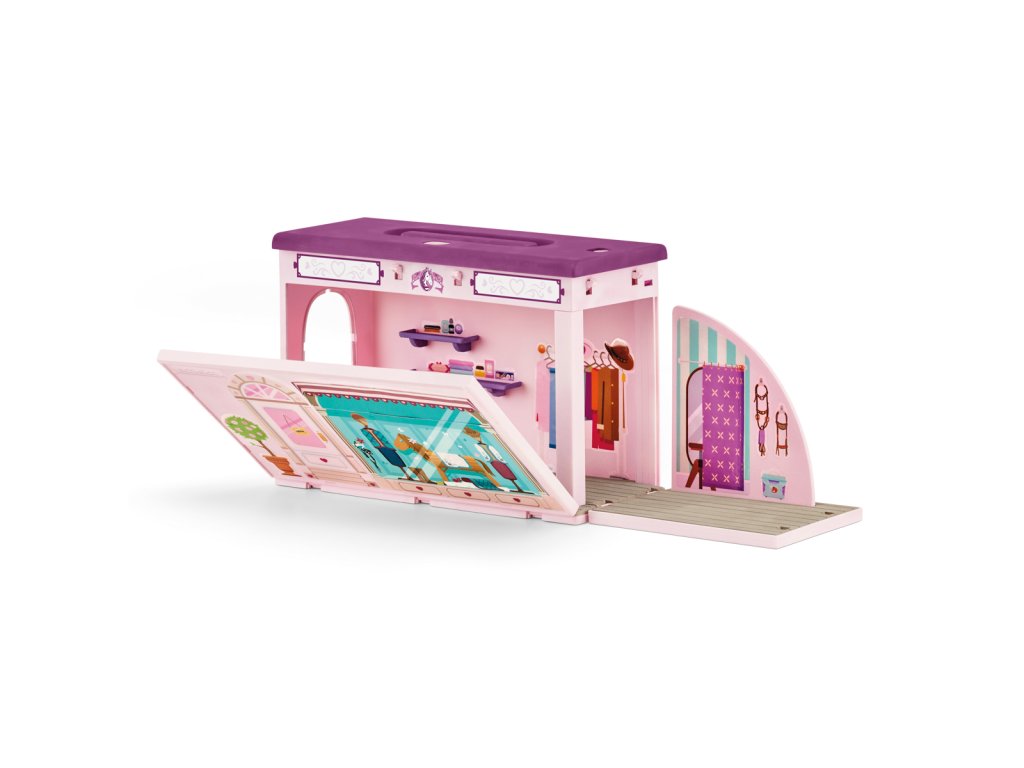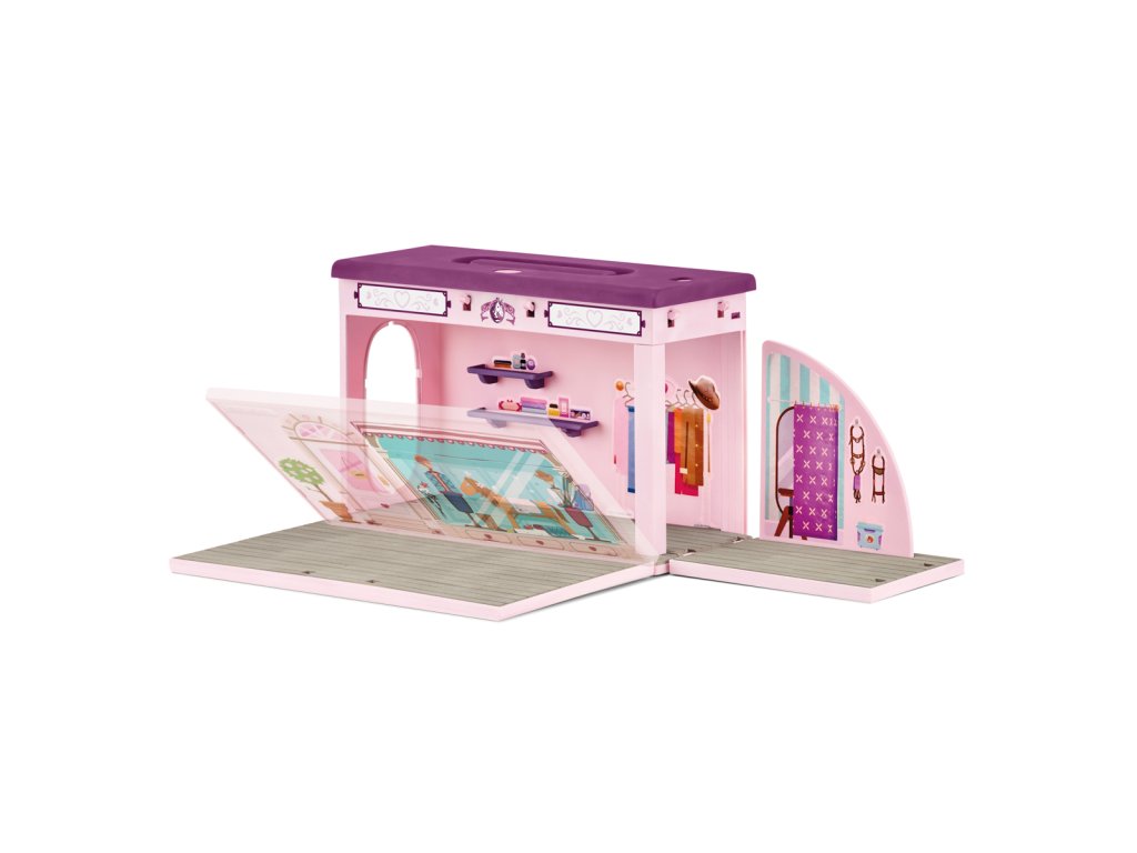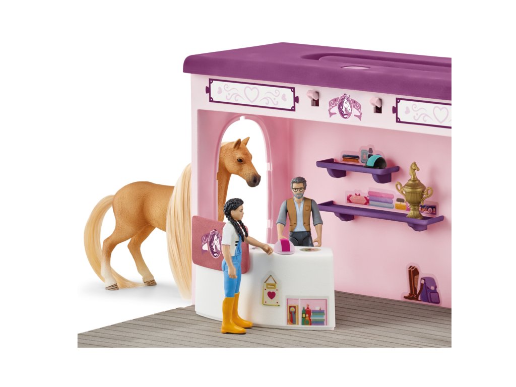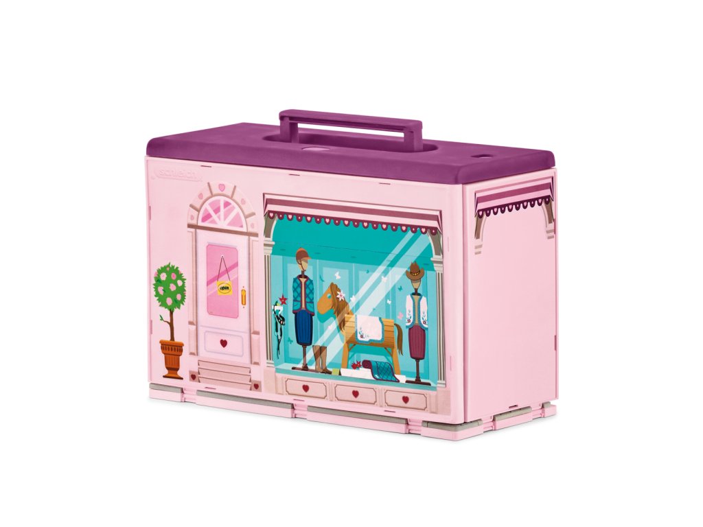 V mobilnom butiku z kolekcie Schleich® HORSE CLUB Sofia's Beauties nájdeš skvelé deky a doplnky v mnohých rôznych farbách, takže si každý kôň nájde to svoje. Vieš, že hrivy a chvosty môžeš nielen zapletať a upravovať, ale aj vymieňať? Sofia a jej kobyla sa tak nemusia držať len jedného účesu. Ideálne pre každé focenie. Aj keď sa odohráva na ihrisku za domom. Celý butik môžeš ľahko zložiť a vziať so sebou. Preto, prosím, nehýbať a povedzte „sýr“! Sada obsahuje: 1× prenosný kufrík na hračky s nasledujúcim vybavením: 1× Quarter Horse s kartáčovateľnou hrivou a chvostom, 1× plne pohyblivá figúrka pana Mitchella, 1× plne pohyblivá figúrka Kim, 1× butik, 1× zrkadlo, 1× pult, 2× police, 1× stojan, 1× rastlina v kvetináči, 1× predajný box veľký, 1× predajný box malý, 2× jazdecký klobúk, 1× sponky do hrivy, 1× koráliky do hrivy, 1× čelenka, 2× deka pre koňa, 2× krátka deka pre koňa, 1× návleky, 1× pokladňa, 1× trofej. Rozmery: 28,2 x 18,6 x 11,8 cm Vek: 3+Dodatočné parametre