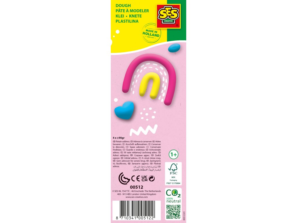 Modelovací hmota Feel-good 4 x 90 g. Modelovací hmota SES ve čtyřech veselých barvách – neon růžové, světle modré, oranžové a žluté. Modelovací hmota je plně veganská, bezlepková a super omyvatelná. Je zářivá a měkká. Díky uzavíratelnému obalu vám modelovací hmota vydrží déle ve správné kvalitě. Už jste si dohráli s modelovací hmotou? Naskenujte QR kód na obalu a zjistěte, co všechno s ní můžete dělat. Stimuluje kreativitu, podněcuje fantazii a rozvíjí motoriku. Řada modelín SES Feel Good umožňuje kreativní tvoření nejmenším dětem již od 1 roku. Baleno v krabičce. Rozměry balení: 20 x 7 x 7 cm.Dodatočné parametre