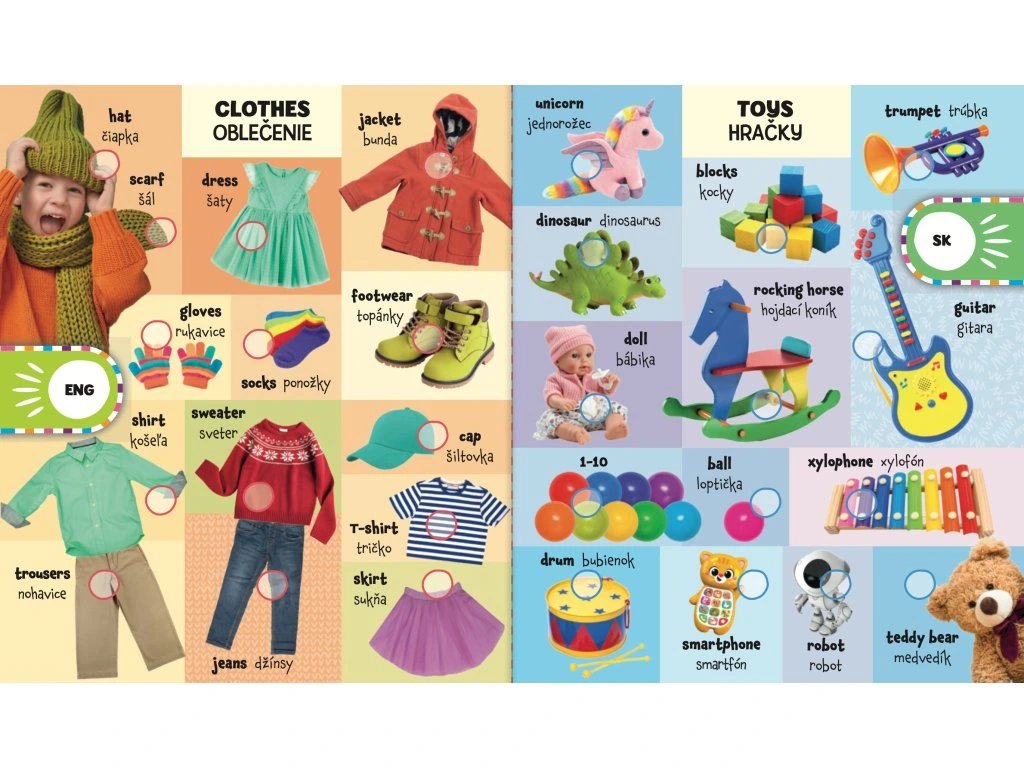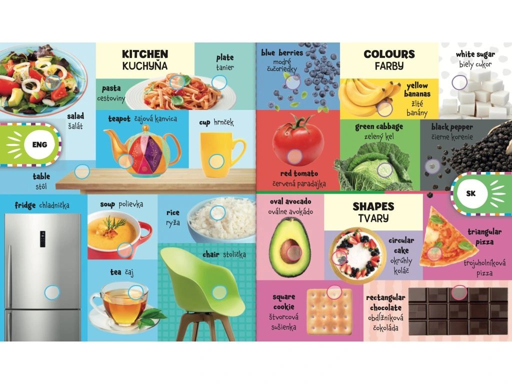 Moje prvé slová - Učím sa po anglicky Učenie angličtiny pre najmenších Moje prvé slová – Učím sa po anglicky je interaktívna bilingválna kniha, ktorá prináša zábavu aj učenie v jednom. Pomocou farebných fotografií, tematických okruhov a zvukov sa deti hravou formou zoznamujú so základnými slovami v slovenčine aj angličtine. Každý obrázok možno aktivovať jednoduchým dotykom – deti počujú výslovnosť a lepšie si zapamätajú nové slová. Kniha podporuje rozvoj slovnej zásoby, výslovnosti a porozumenia v oboch jazykoch. Ideálna pre deti od 2 rokov, ktoré sa radi učia prostredníctvom hier, zvukov a obrázkov. Dotykové tlačidláSlovná zásoba z rôznych oblastíFarebné a atraktívne obrázkyDvojjazyčný obsah: slovenský a anglický jazykIdeálne pre prvé jazykové krôčikyDodatočné parametre
