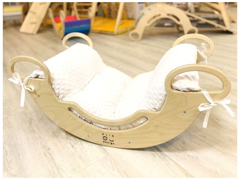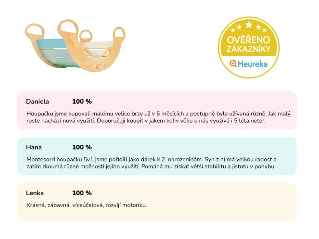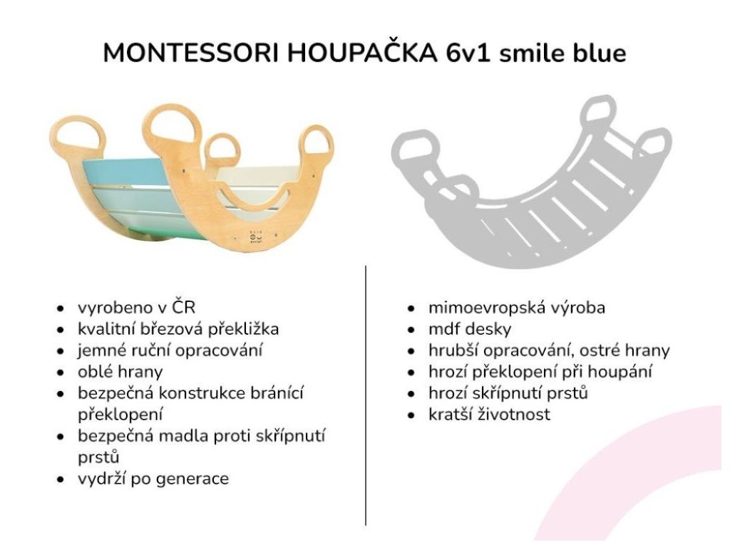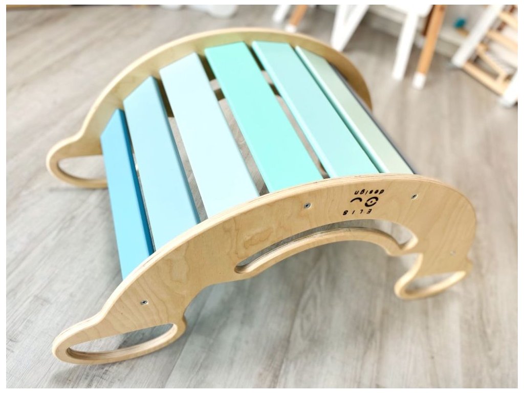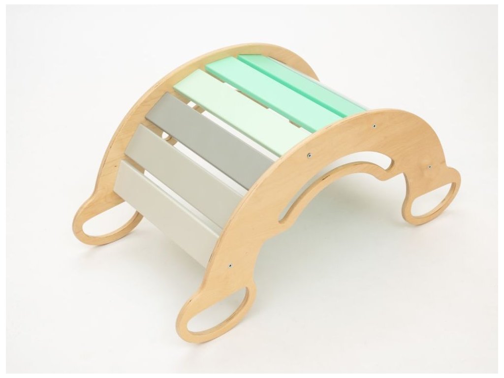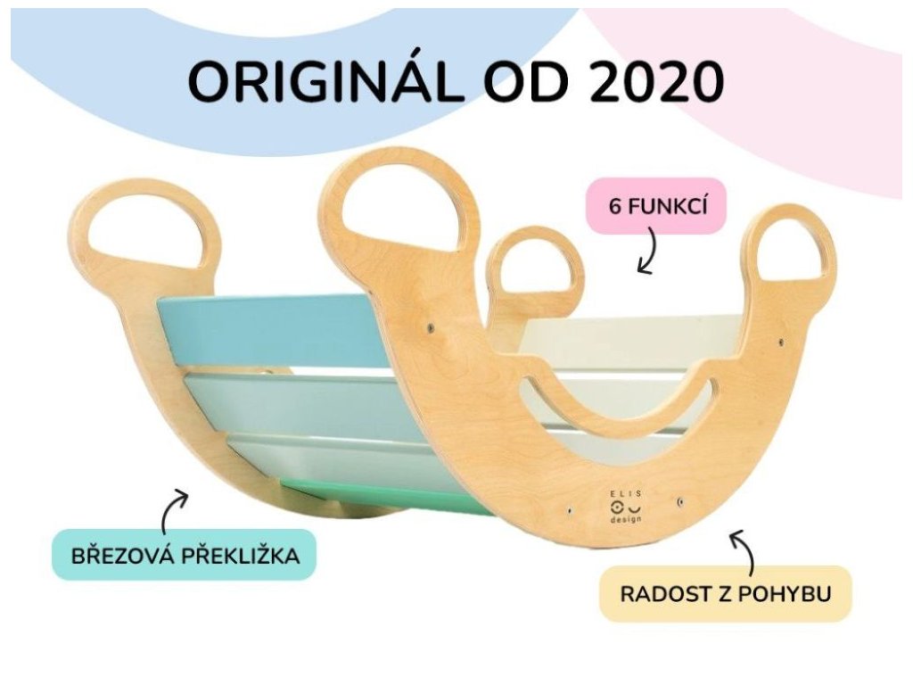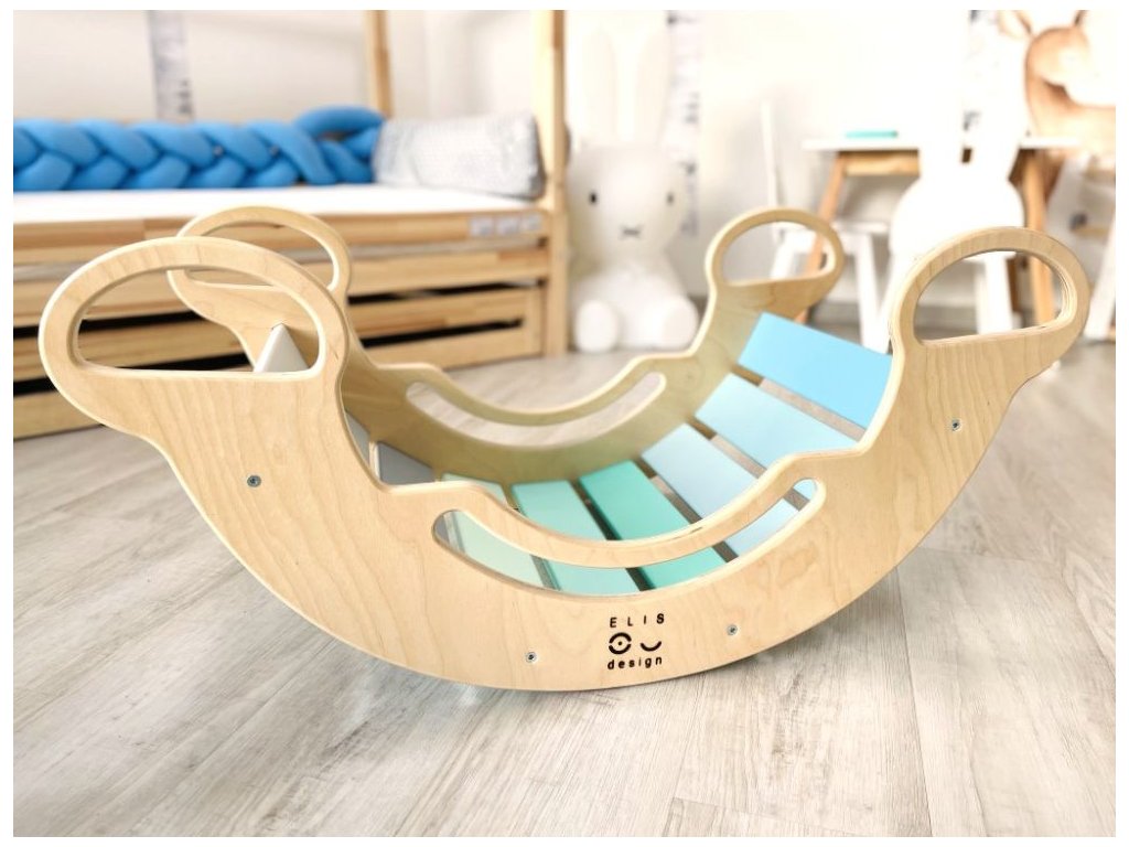 Drevená multifunkčná hojdačka smile v jemných modro-zelených pastelových farbách v kombinácii so sivou je vhodná do dievčenskej aj chlapčenskej detskej izby, detskej herni, hracieho kútika. Svojimi veselým dizajnom vyvoláva deti ku hre. Rôznym pretáčaním sa jednoducho zmení na preliezku, pult na hračky, na veselú skrýšu, šmykľavku a vďaka nosnosti 110 kg na sedačku nie len pre deti. Obojstranná doska, ktorá nie je súčasťou hojdačky, premení hojdačku v praktický stolík. Malým deťom sa v nej, pomocou mamkinho pohojdávania, bude dobre zaspávať, najmä ak ju doplníte našim mäkkým poťahom minky. Bočné úchopy v tvare širokého úsmevu poskytne istotu aj najmenším deťom a horné držadla zabezpečujú stabilitu hojdačky. Úchopy vo forme postranných výrezov nevyčnievajú tak a zaisťujú ešte viac bezpečia. Povrch multifunkčnej montessori hojdačky je ručne dohladka opracovaný, všetky hrany sú zaoblené. Farby sú atestované na použitie na detských hračkách. Dievčatá aj chlapci, od 1 roku, sa môžu na hojdačke hojdať, môžu ju preliezať, podliezať, môžu sa s ňou hrať, ale vždy pod dohľadom dospelej osoby. Originálna hojdačka ELIS DESIGN je certifikovaná podľa normy EN 71-1, 2, 3. Hojdačka je vyrobená z 15 mm hrubej, ručne opracovanej brezovej preglejky. Obrovskou výhodou je, že povrch dosiek je pevný a odolný voči oderom a škrabancom. Dosky sú presne vyfrézované, aby ich bolo možné dokonale zasadiť. Hojdačka je vylepšená inovatívnym systémom dotiahnutia dosiek. Pre lepšiu fixáciu sú dosky osadené pomocou špeciálnych skrutiek (konfirmátov). Novým doplnkom sú aj korkové podložky pre lepšie upevnenie dosiek. Moderné, jednoduché, veselé (smile) prevedenie a jemné pastelové farby prepožičali hojdačke, najmä v detských očiach, kúzlo neobyčajnosti a zaujímavosti. Táto hračka splní úlohu štýlového a neprehliadnuteľného doplnku interiéru. Vďaka osadeniu farebných dosiek pomocou skrutiek môžete pri montáži aj kedykoľvek inokedy meniť farebné usporiadanie niektorých dosiek, či už podľa vášho vkusu alebo podľa priania vašich detí. Multifunkčnú hojdačku smile, ktorá je širšia než naše klasické Montessori dúhové hojdačky 5v1, pomocou drevenej dosky k hojdačke smile ju premeníte na zábavné detské ihrisko, ktoré prispeje k zdravému motorickému rozvoju vášho dievčatka či chlapca. Obojstranná doska je nielen šmýkačkou a doskou na šplhanie, ale zároveň aj praktickým stolíkom, vďaka ktorému si deti môžu maľovať kdekoľvek. Stačí ju položiť na Montessori hojdačku smile a prisunúť malú detskú stoličku. Vo videu nižšie, sa môžete pozrieť do výroby našej Montessori hojdačky spolu s dizajnérmi relácie Postav si sen. Veľkosť produktu: 85 x 43,5 x 40 cm. Medzera medzi doskami: 14 mm. Nosnosť: 110 kg. Hmotnosť: 5,4 kg. Certifikáty: CE, 2009/48/ES, EN 71-1, EN 71-2 a EN 71-3. Odporúčaný vek: Od 1 roka. Upozornenie: Hojdačka je vyrobená z prírodného materiálu, ktorý môže mať odlišný odtieň (farbu), než na fotografiách. Môžu sa striedať tmavé a svetlé odtiene (najmä na hranách). Keby sa vám štruktúra dreva nepáčila, neváhajte sa nám ozvať. Vaša spokojnosť je pre nás prioritou. Obojstranná doska nie je súčasťou hojdačky, pre využitie hojdačky ako nábytku je nutné dosku samostatne dokúpiť. Vhodný doplnok: Obojstranná doska ktorá premení Motessori detskú hojdačku smile 6in1 na originálny detský nábytok. Mäkké polstrovanie Poťah na Montessori hojdačku 5v1 - minky. Jedná sa o jediný poťah z našej ponuky, ktorý je pre túto širšiu multifunkčnú hojdačku vhodný. Ako hojdačku vyrábate? Poďte si prejsť proces výroby s dizajnérmi relácie Postav si sen prostredníctvom videa vyššie. Je hojdačka bezpečná pre deti? Ako hojdačku testujete? Originálna hojdačka ELIS DESIGN je testovaná, vhodná a bezpečná pre deti a vydrží vašim deťom dlho. Naša hojdačka spĺňa požiadavky smernice o bezpečnosti hračiek 2009/48/ES a normy o neškodnosti a bezpečnosti hračiek EN 71-1, 2, 3, kedy sa testujú mechanické a fyzikálne vlastnosti, horľavosť aj migrácia určitých látok. Hojdačku otestoval a Certifikát o zhode (Osvedčenie o zhode - CE) udelil technický a skúšobný ústav. Pri hojdačke ELIS DESIGN máte istotu, že je pre vaše deti vhodná a bezpečná, je vyrobená z kvalitnej preglejky, je testovaná, má do detailu opracované hrany a na náter sú použité netoxické, zdravotne neškodné laky a farby, nechýbajú technologické vychytávky. Prečo si vybrať Montessori hojdačku smile od ELIS DESIGN? Povrch hojdačky je hladký, jej povrch niekoľkokrát prebrusujeme a niekoľkokrát lakujeme. Používame 1,5 cm hrbú výberovú preglejku s minimom vzduchových bublín. Preglejka je použitá ako na boky tak na dosky - hojdačka je veľmi odolná. Dosky sa zasadzujú do vyfrézovaných otvorov a jej nosnosť je cca 110 kg. Hojdačku osadzujeme kvalitným konfirmátom (špeciálne šrauby), pre maximálne dotiahnutie a fixáciu dosiek. Hojdačka smile je širšia než naše klasické Montessori dúhové hojdačky. Po doplnení hojdačky obojstrannou doskou k hojdačke smile, ju jednoducho premeníte vo veselý a ľahko prenosný detský stolík, vďaka ktorému si deti môžu maľovať naozaj kdekoľvek. Stačí prisunúť detskú stoličku alebo rovno zadovážiť set hojdačky smile s obojstrannou doskou a drevenou stoličkou. Aká dlhá je dodacia doba? Hojdačky máme skladom, dostupnosť uvidíte pri zobrazení zvoleného variantu. Pokiaľ je variant dostupný, hojdačku expedujeme do týždňa. Ako náročné je hojdačku zložiť? Montáž je veľmi jednoduchá, návod nájdete v našom videu a podľa užívateľských recenzii sa s ňou poperú dokonca aj šesťročné deti.Dodatočné parametre
