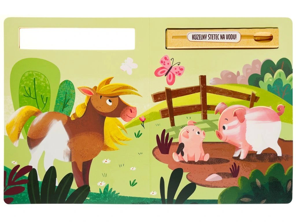 Na farme - Nechaj ožiť farby Čarovné maľovanie vodou: farby na farme ožijúPretri štetcom biele miesta v tejto knihe určenej na maľovanie vodou. Obrázky zvierat z farmy sa ako kúzlom objavia a po uschnutí farby zasa zmiznú.Dodatočné parametre