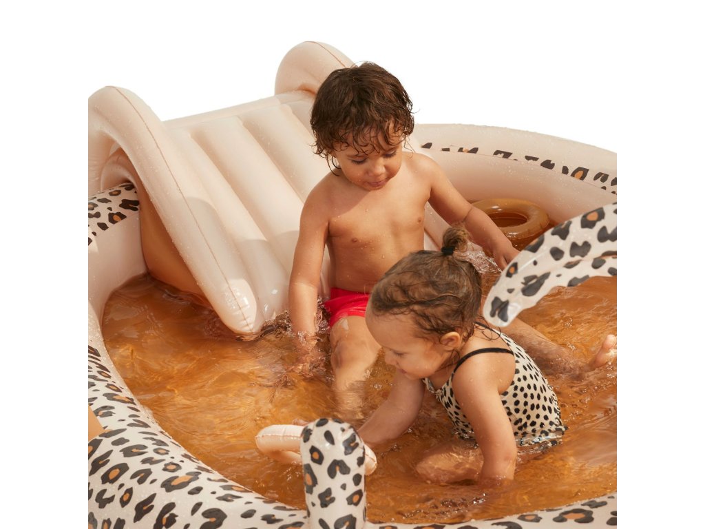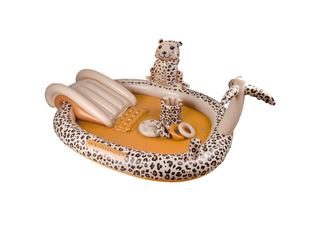 Nafukovací bazén so šmykľavkou Beige Leopard 210 cm Doprajte vašim deťom dokonalé vodné ihrisko! Detský nafukovací bazén so šmykľavkou od Swim Essentials s luxusným leopardím vzorom v béžových farbách sa stane zdrojom nekonečnej vodnej zábavy pre vaše deti. Je to skvelý nafukovací bazén, aj vodné ihrisko na záhradu. Je veľký 210 x 150 cm, má 7 nafukovacích komôr a zmestí sa doň až 230 litrov vody. Pravé letné osvieženie zaistí rozstrekovač Bazén so šmykľavkou Leopard však obsahuje aj rozstrekovač, ktorý je možné napojiť k vašej záhradnej hadici s redukciou. Vďaka striekajúcej vode budú mať vaše deti túto vodnú zábavu ešte radšej. Nechýba ani malá šmykľavka a rôzne ďalšie nafukovacie doplnky, ako sú 3 malé kruhy alebo malé sedadlo do vody. Kvalitný nafukovací bazén so šmykľavkou bude pýchou vašej záhrady Prémiová holandská značka Swim Essentials sa pri všetkých svojich výrobkoch zameriava na vysokú kvalitu, funkčnosť a neopozeraný štýl. Aj nafukovací bazén so šmykľavkou je preto vyrobený z odolného PVC. Vďaka tomu sú veľmi pevné a niečo vydržia. Značka taktiež každý rok prináša nové špičkové designy, na ktorých si dáva veľmi záležať. Balenie bazéna je vyrobené z recyklovaného kartónu a nájdete v ňom aj jeden set na opravu prípadných dier. Nechýba ani bezpečnostné testovanie hračiek EN-71.Dodatočné parametre