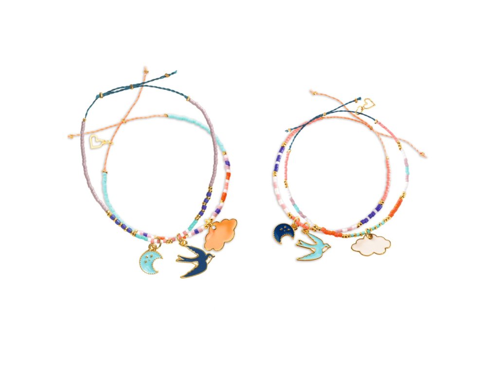 Náramky Obloha Náramky priateľstva ako štýlové módne doplnky. Sada You & Me (Ty a ja) obsahuje korálky a prívesky na zhotovenie 2 náramkov - pre seba a milú osobu, alebo obe na podarovanie. Všetko je zabalené vo vkusnej škatuľke. Materiál je zladený tak, aby bol výsledok úžasný: 2 viacvrstvové korálkové náramky s príveskami v tvare vtáčika, obláčika a mesiačika. Druhým krokom je náramok podarovať. Súčasťou sady sú 2 vrecúška z organzy a krásne ilustrované karty na napísanie venovania.Obsah: 475 korálok, 8 príveskov, 2 m voskovanej šnúrky, 2 ihly, 1 obrázkový návod, 2 vrecúška z organzy, 2 ilustrované kartyOdporúčaný vek: 8+ rokovRozmery balenia: 16 x 12 x 3 cmDodatočné parametre