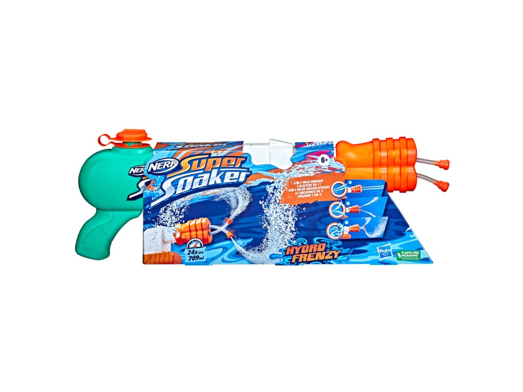Rozbalte to s vodními blastry NERF Super Soaker a zažijte skvělé vodní dobrodružství! Tyhle venkovní hračky nejsou jen pro děti, skvěle se s nimi vyřádí i dospělí. Na co ještě čekáte? Honem je běžte naplnit a hurá do akce. Vodní bláster NERF Super Hydro Frenzy má v hlavni 2 trubice na vodu. Trubice se při výstřelu otáčí a vypouští proudy vody do všech směrů. Stačí naplnit zásobník blastru Super Soaker vodou, pumpováním natlakovat komoru vzduchem a můžete vyrazit do boje. Vyrobeno z kvalitního plastu v barvě zelené, bílé a oranžové. Rozměr balení: 18,4 x 51,1 x 5,7 cm. Vhodné od 6 let.Dodatočné parametre