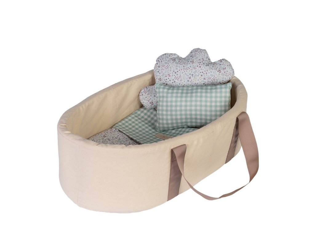 Okrem toho praktické rukoväte kakaovej farby umožňujú ľahké prenášanie nosiča a podporujú hru na rôznych miestach a v rôznych situáciách. Súprava obsahuje aj krásnu súpravu posteľnej bielizne v jemných odtieňoch mäty a béžovej , ktorá pozostáva z: prestieradla/prikrývky, klasického vankúša a dodatočného vankúša v tvare obláčika v pôvabnom kvetinovom spojení.