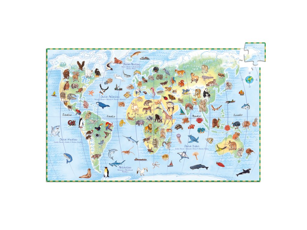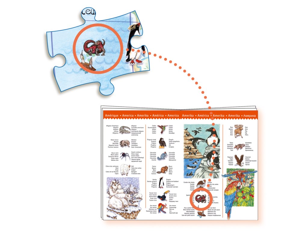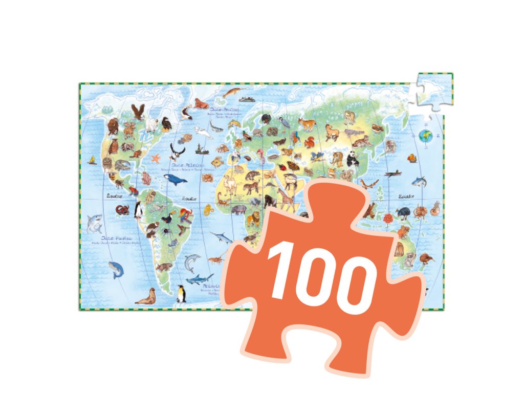Objavovacie puzzle Zvieratá sveta 100 ksSpoznávaj zvieratá sveta a uč sa hrouPonorte sa do fascinujúceho sveta zvierat všetkých svetadielov a morí s Objavovacím puzzle Zvieratá sveta. Po doskladaní 100 dielikov sa puzzle zmení na náučnú hľadaciu hru, kde deti precvičia pozorovacie schopnosti: dokážu nájsť jednotlivé zvieratá podľa brožúrky, ktorá obsahuje názvy a miesta ich výskytu. K dispozícii je aj plagát rovnakých rozmerov ako puzzle, ktorý slúži ako predloha a podložka na skladanie. Hrubé a odolné dieliky zaručujú, že puzzle vydrží opakované skladanie a dlhé hodiny zábavy. Vyrobené v Európe (Španielsko) z ekologickej lepenky a papiera s FSC® certifikátom Farby na rastlinnej báze, matný povrch pre lepší vizuálny zážitok Obsah balenia: 100 dielikov, 1 brožúrka, 1 plagát Objavovacie puzzle Zvieratá sveta je ideálne pre deti od 5 rokov, ktoré sa chcú hrať, učiť a spoznávať zvierací svet zábavnou formou.Dodatočné parametre