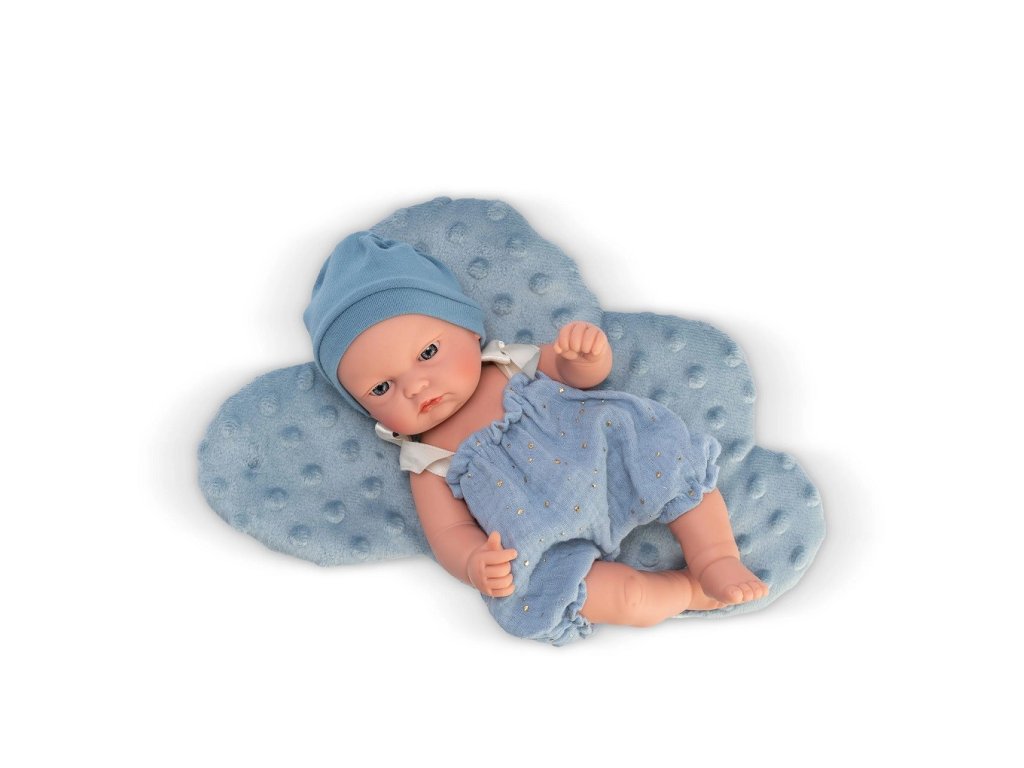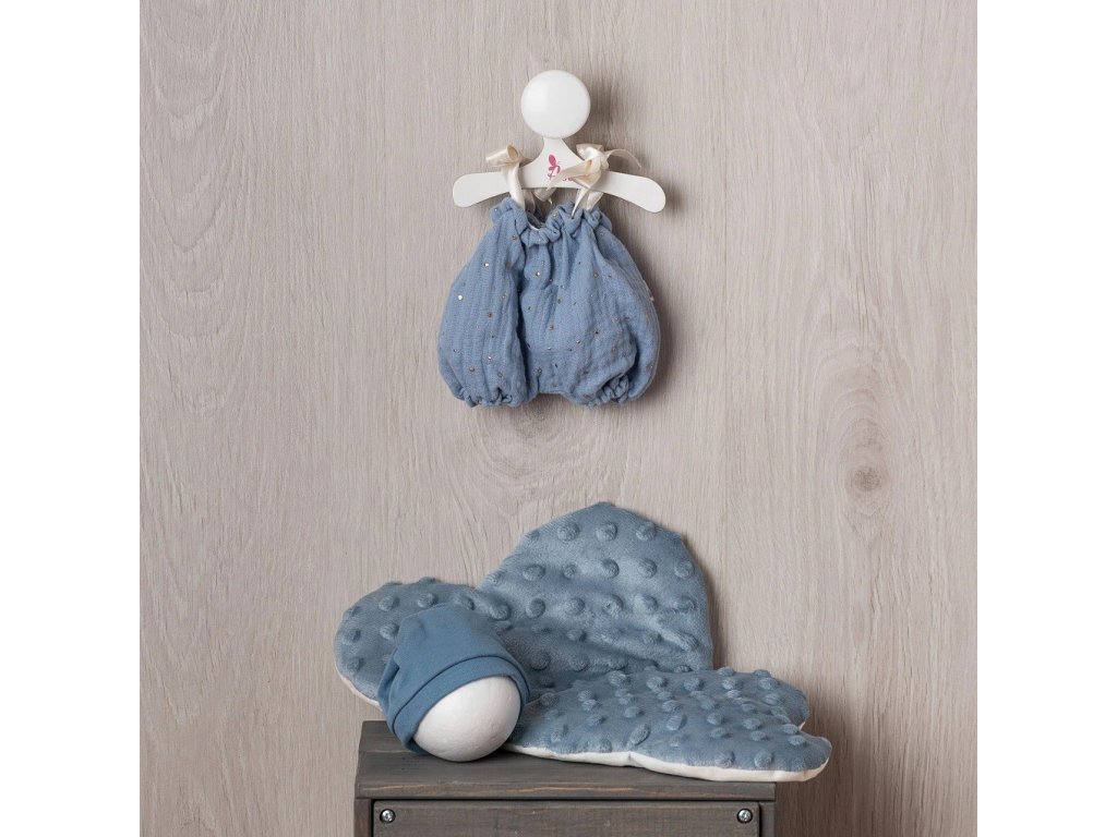 Ručne šitý, mäkký, mušelínový modrý overal so saténovými ramienkami bol navrhnutý špeciálne pre španielske bábiky zo série ASI Gordi. Outfit je doplnený teplou čiapkou a prešívanou dekou v tvare oblaku. Pohodlné zapínanie na suchý zips umožňuje jednoduché vyzliekanie a obliekanie oblečenia.