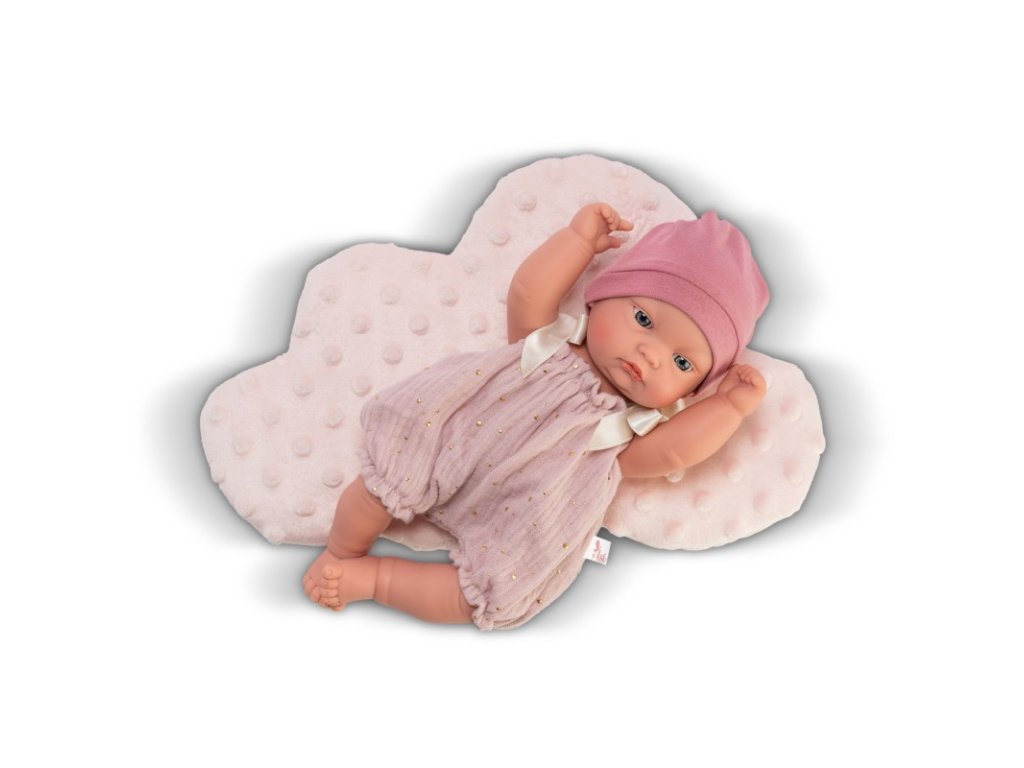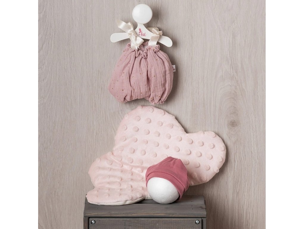 Ručne šitý, mäkký, mušelínový ružový overal so saténovými ramienkami bol navrhnutý špeciálne pre španielske bábiky zo série ASI Gordi. Outfit je doplnený teplou čiapkou a prešívanou dekou v tvare oblaku. Pohodlné zapínanie na suchý zips umožňuje jednoduché vyzliekanie a obliekanie oblečenia.